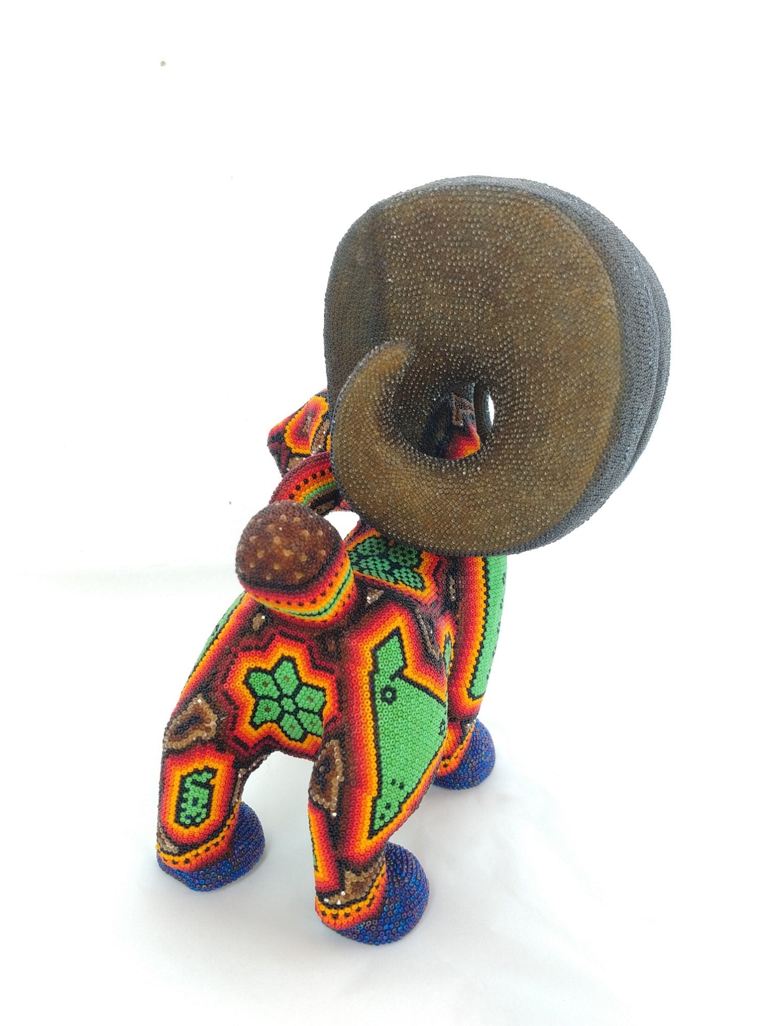 This is piece was done with the new Czech #13 glass micro beads that are almost half the size of the regular beads so the details are absolutely incredible. This pieces measures 8" tall, 7"wide and is 3" deep. Mayola Villa Lopez is the grandaughter of Jacinto Lopez Ramirez, an older Huichol shaman considered to be the grandfather of the commercial bead art.