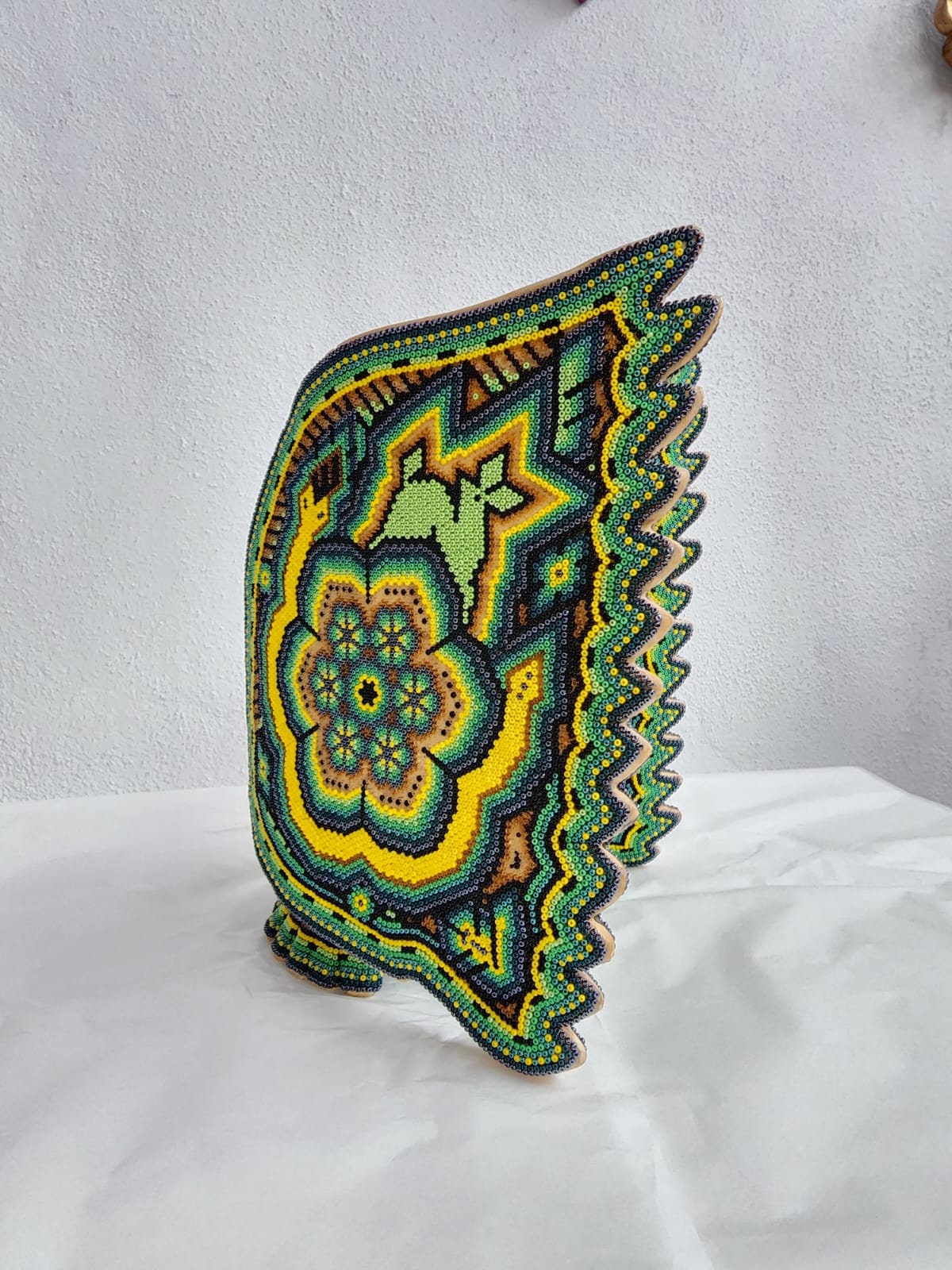 This is a wonderful that stands 11" tall, 8.5" wide and is 8" long. Isandro Villa Lopez is a young father who live in Agua Zarca a small ranch just outside of San Andres Cohamiata. Isandro's grandfather Jacinto Lopez was considered to be the grandfather of the bead art.