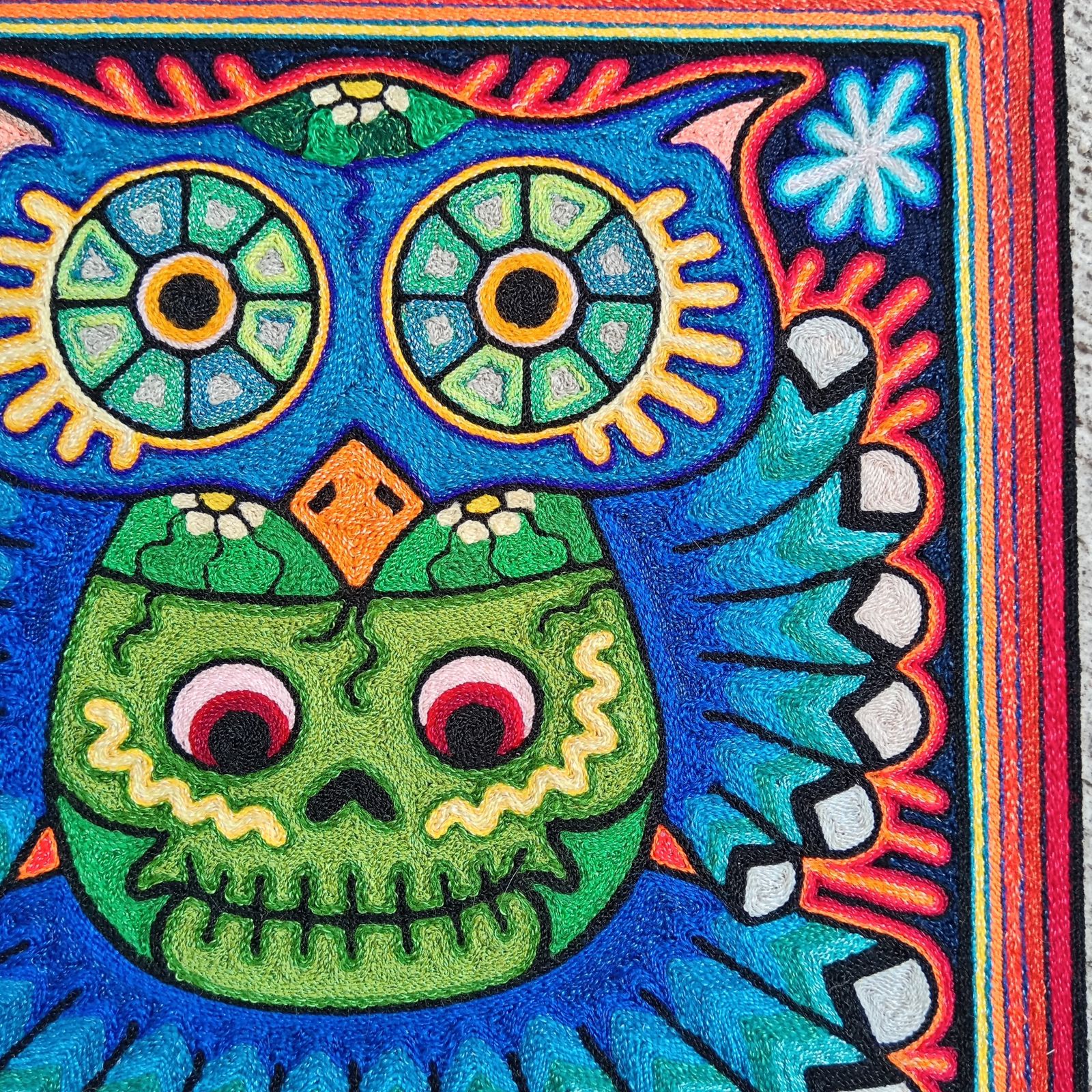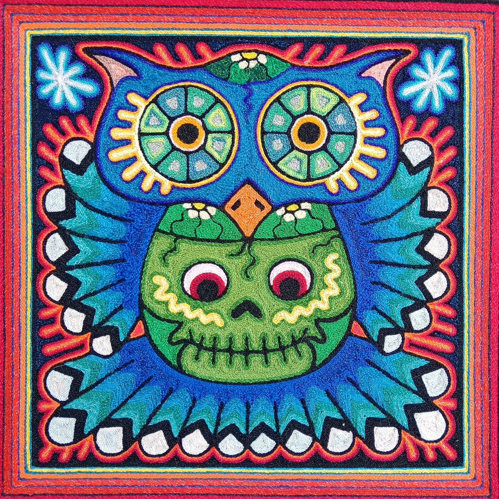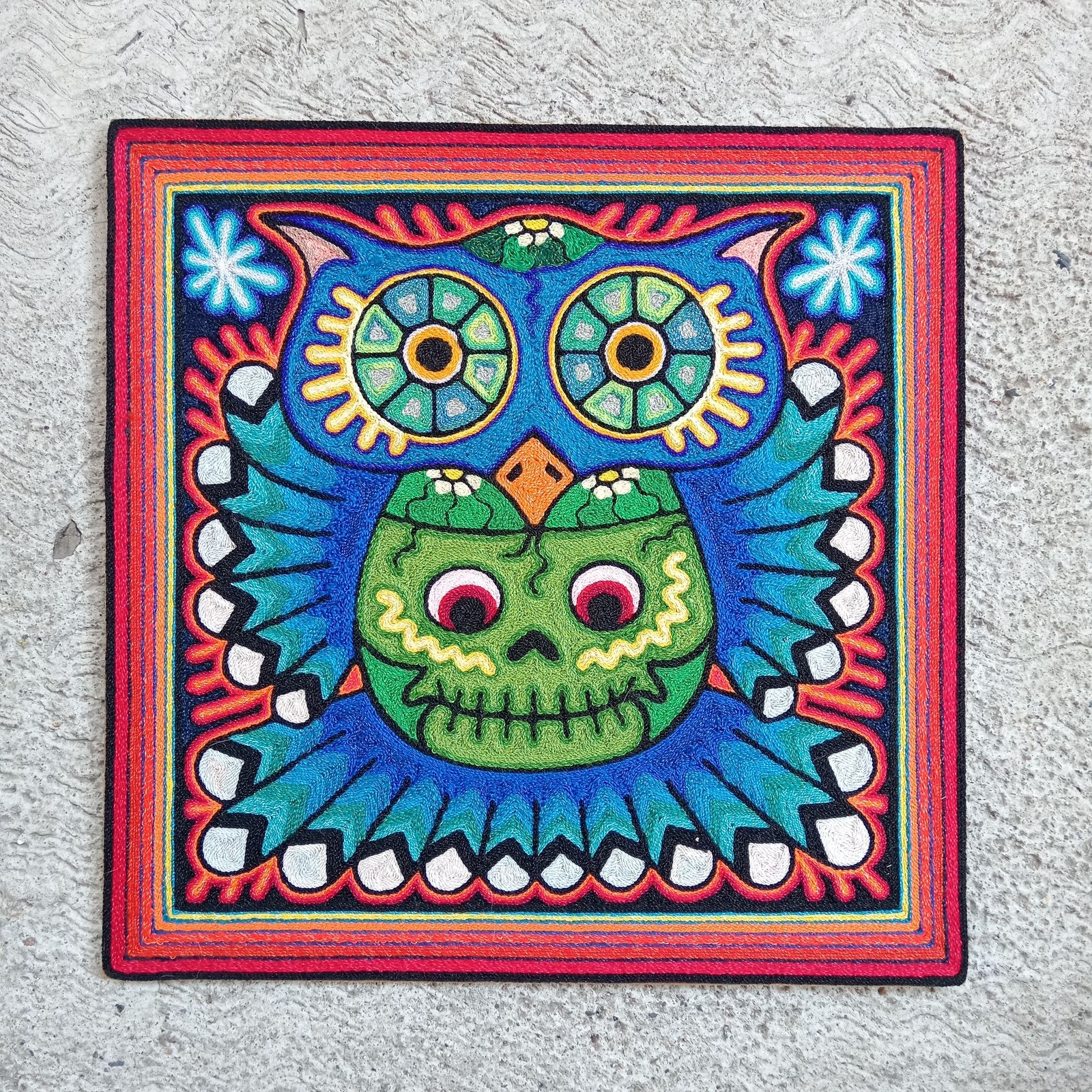 This is an extraordinary yarn painting that measures 12" x 12". The artist, Luis Castro comes from one of the most important families in Huichol art. His great grandfather Hilario Castro was a well respected shaman in the late 1960's, his grandfather Daniel Castro was one of the pioneers of the yarn art in the 1970's and his father is one of the best recognized yarn artist and recently placed 2nd in the Nayarit State Art competition.