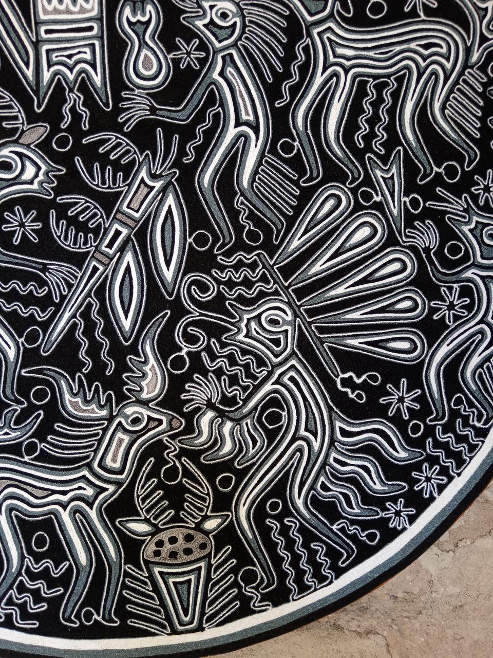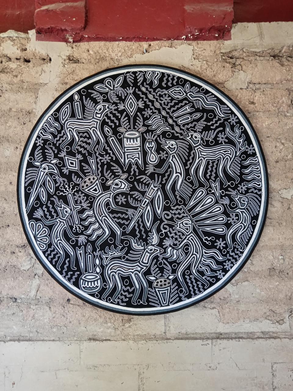 This is an extraordinary yarn painting that measures 40"x 40". The Wixarika (Huichol) people are internationally acclaimed for their artwork. This piece is adorned with symbology from their culture.