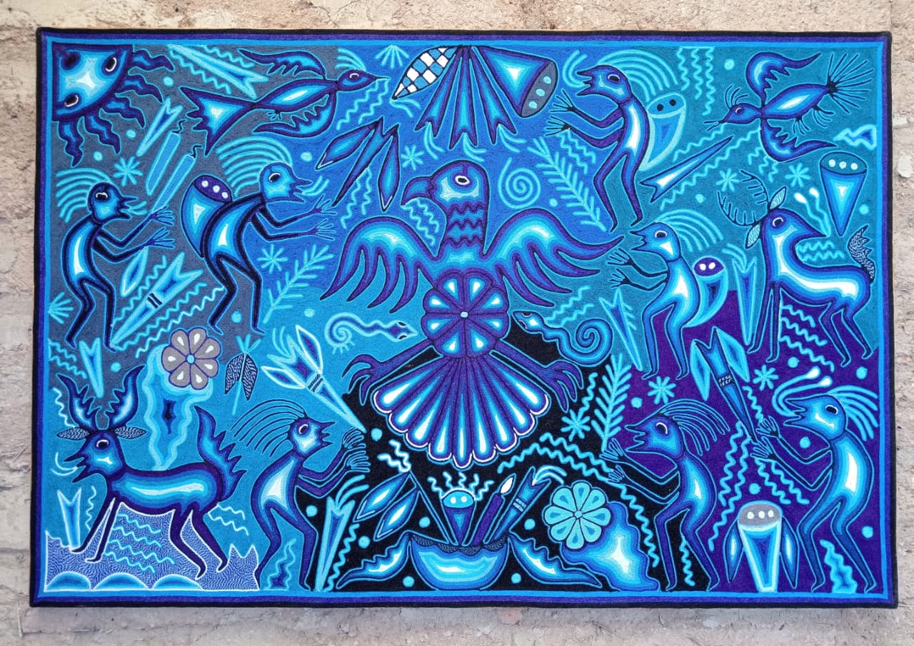 This is an extraordinary yarn painting that measures 48"x 32". The Wixarika (Huichol) people are internationally acclaimed for their artwork. This piece is adorned with symbology from their culture.