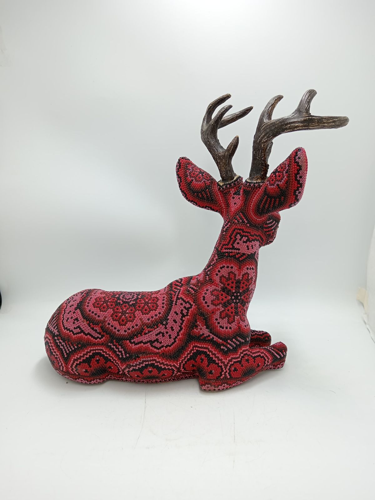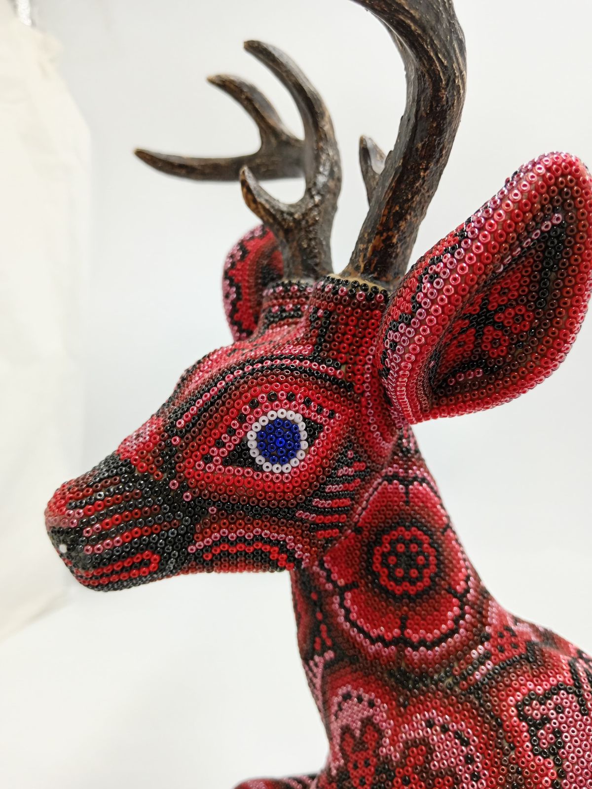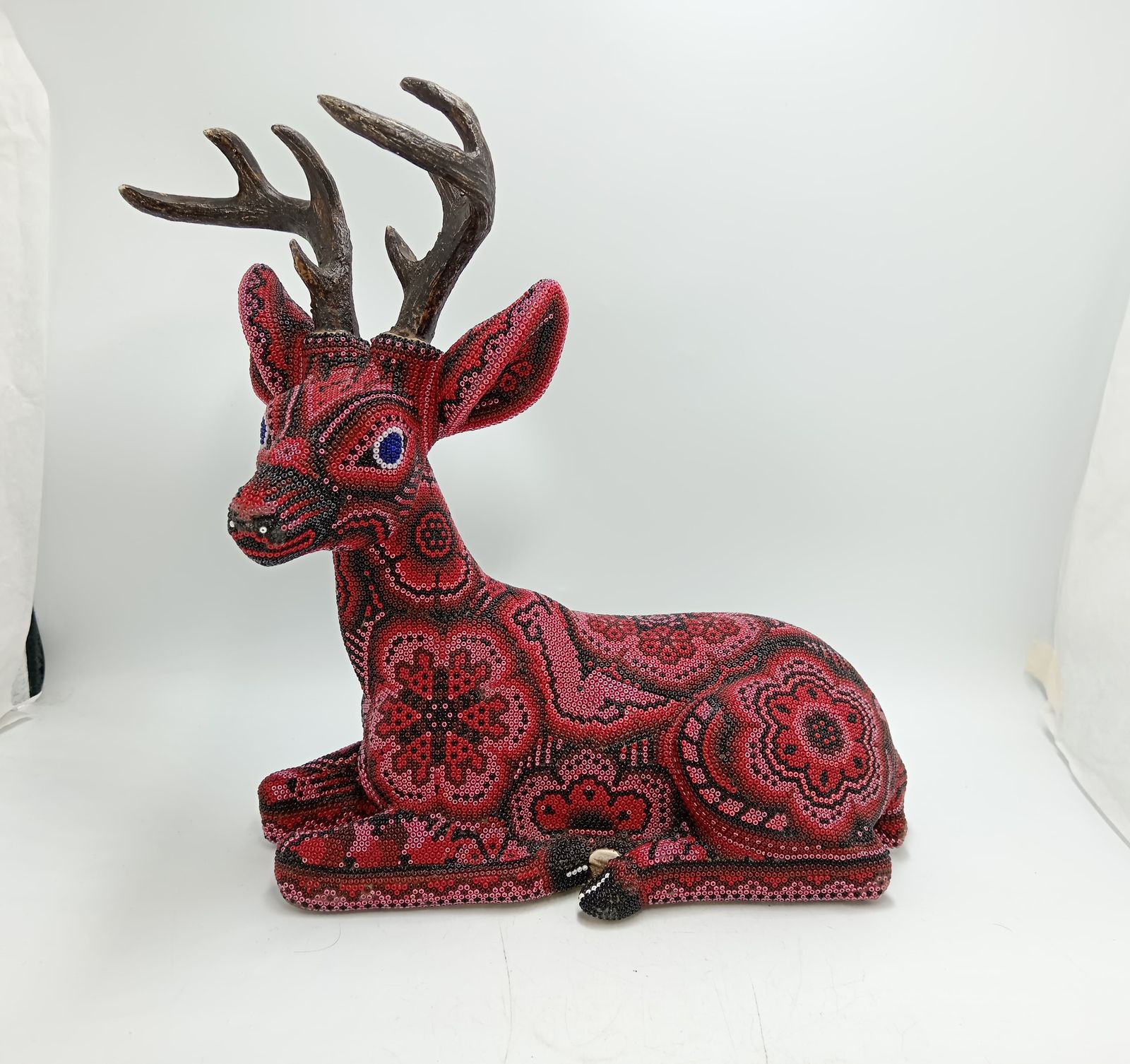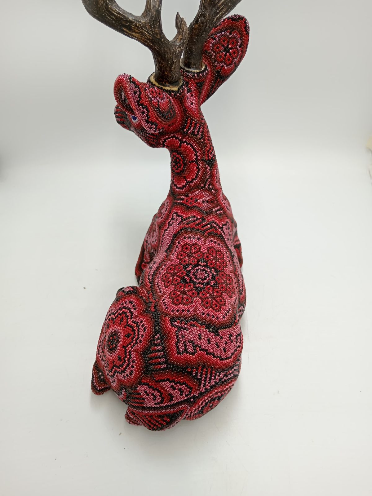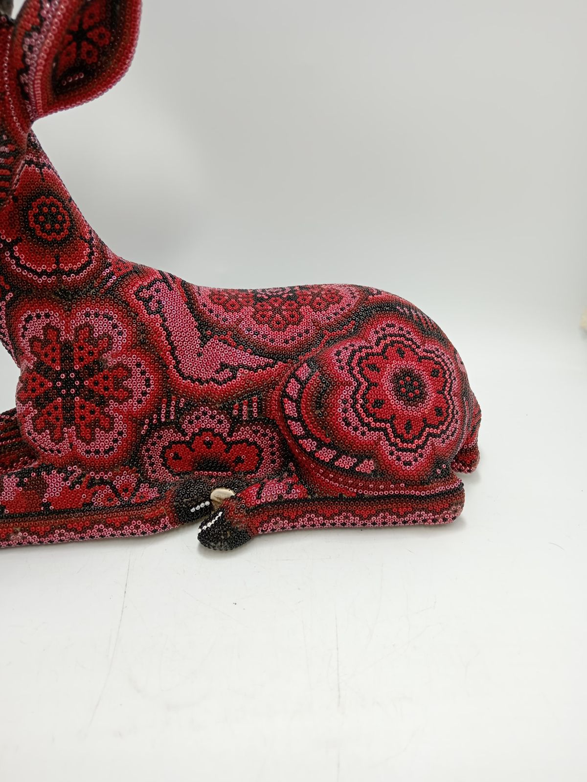 Florencio Lopez Carrillo is the only son of Don Jacinto Lopez Ramirez, a great shaman who was well documented in the 1970's and is featured in the 1978 book 'Art of the Huichol'. Jacinto and his family including Florencio are considered to be one of the most important families in the commercialization of the bead art. Florencio is by trade a politician, he has served his community as sheriff or commisario, and was the municipal delegate of his community. Because of his expirience we have gone to great lengths to import special Czech #13 glass beads for him to use in his work. For those who are not familiar with the micro bead, it is just about half the size of the regular bead that is commercially available here in Mexico. The detail that Florencio is able to create with this mirco bead is absolutely astounding. Florencio's work should be cherished not only for its artistic value but also because he is actually involved in the preservation of his cultures traditions.