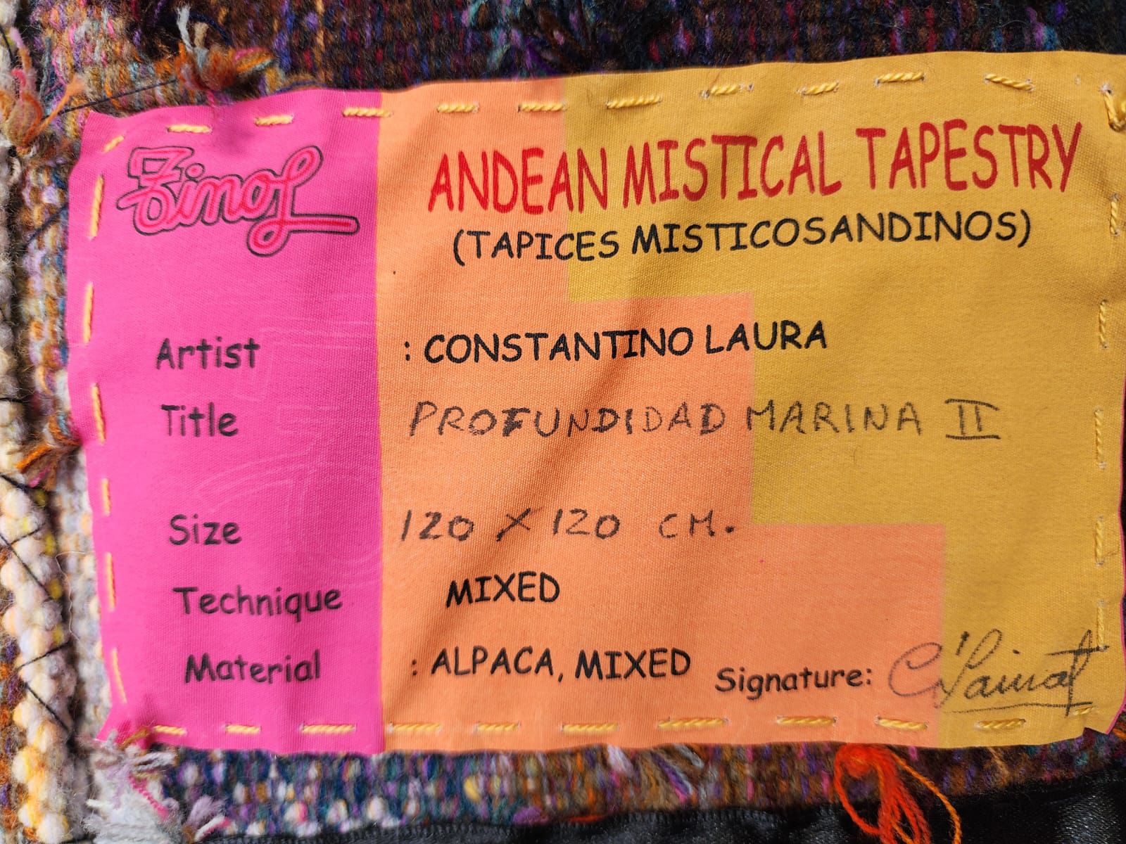 This outstanding tapestry was hand woven on a foot peddle loom with 100% Alpaca fibers by Constantino Laura who has a sensational sense of color. This piece measures 48" x 48"