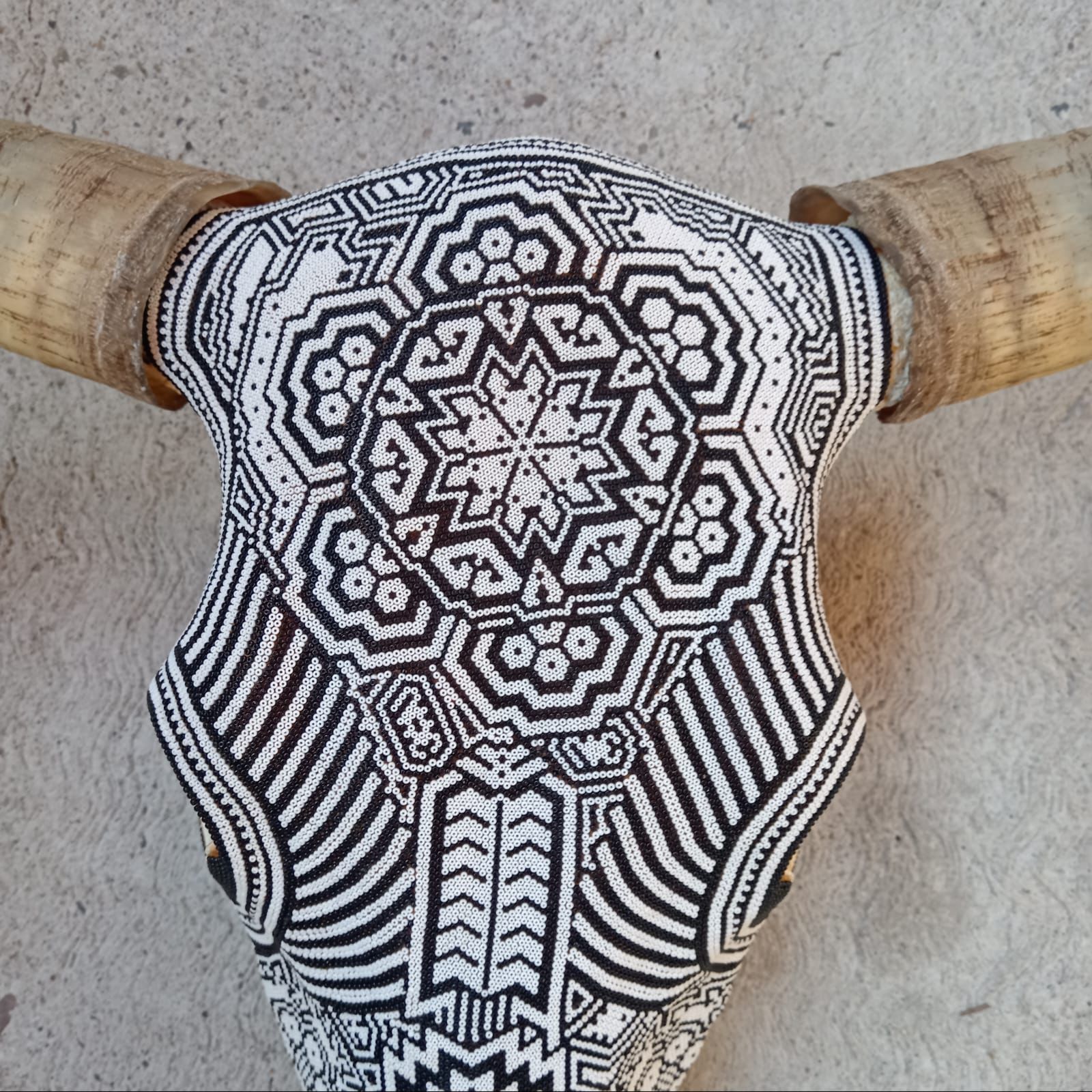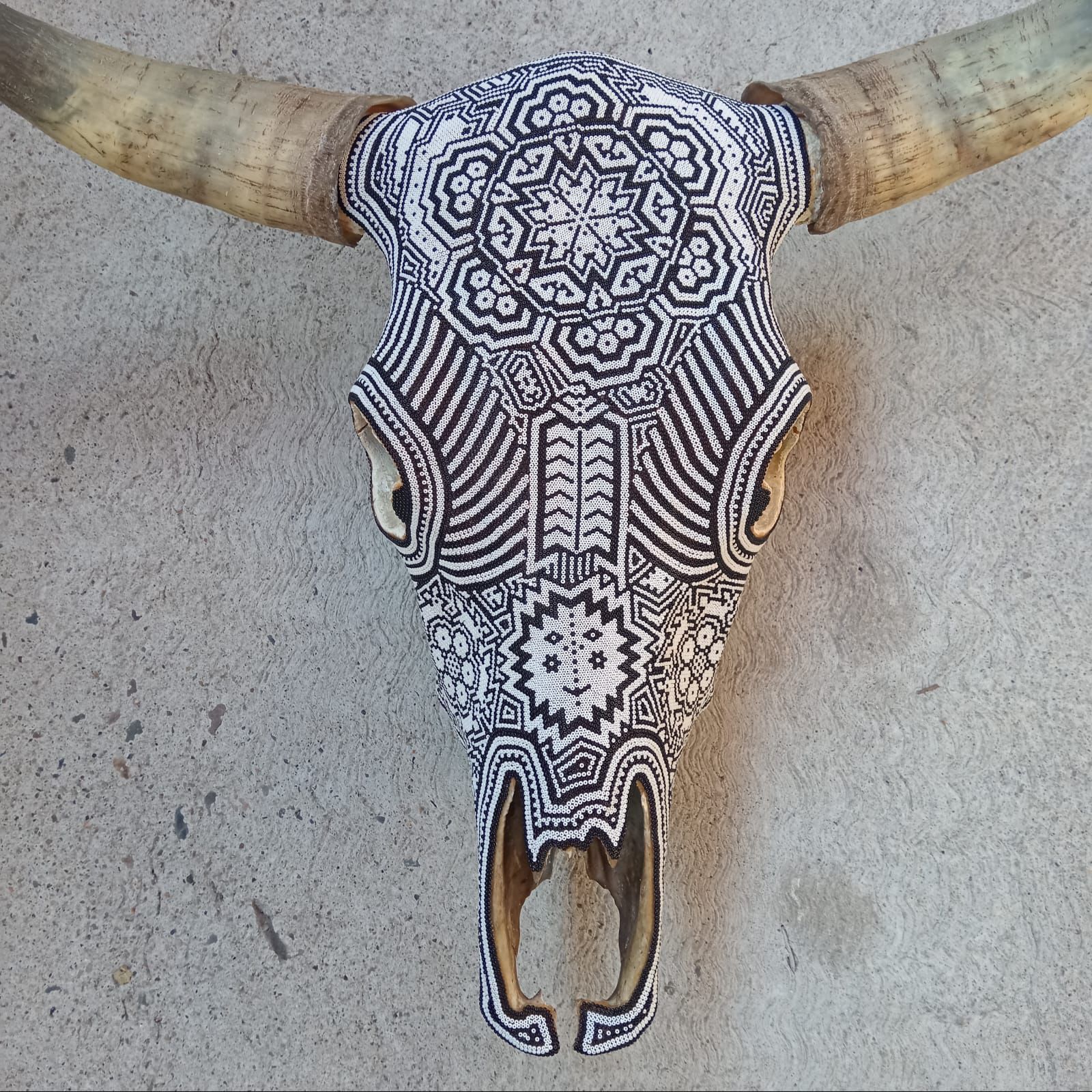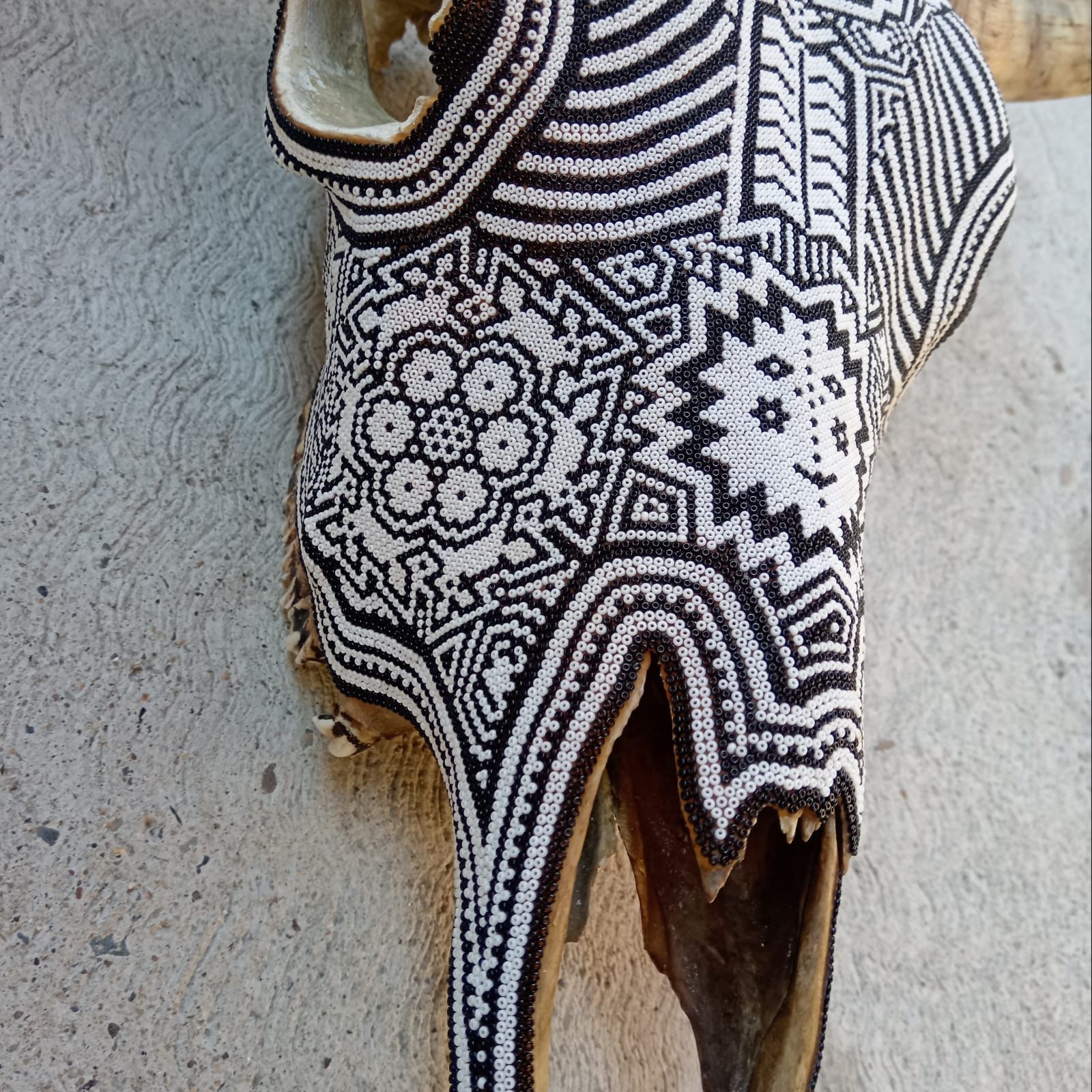 This is a wonderful hand beaded skull by Mayola Villa Lopez from San Andres Cohamiata. This skull measures 25" wide from horn to the the other horn, 25" from the tip of the horn to the tip of the nose, 20" from the top of the head to the tip of the nose and is 10" wide across the eyes.