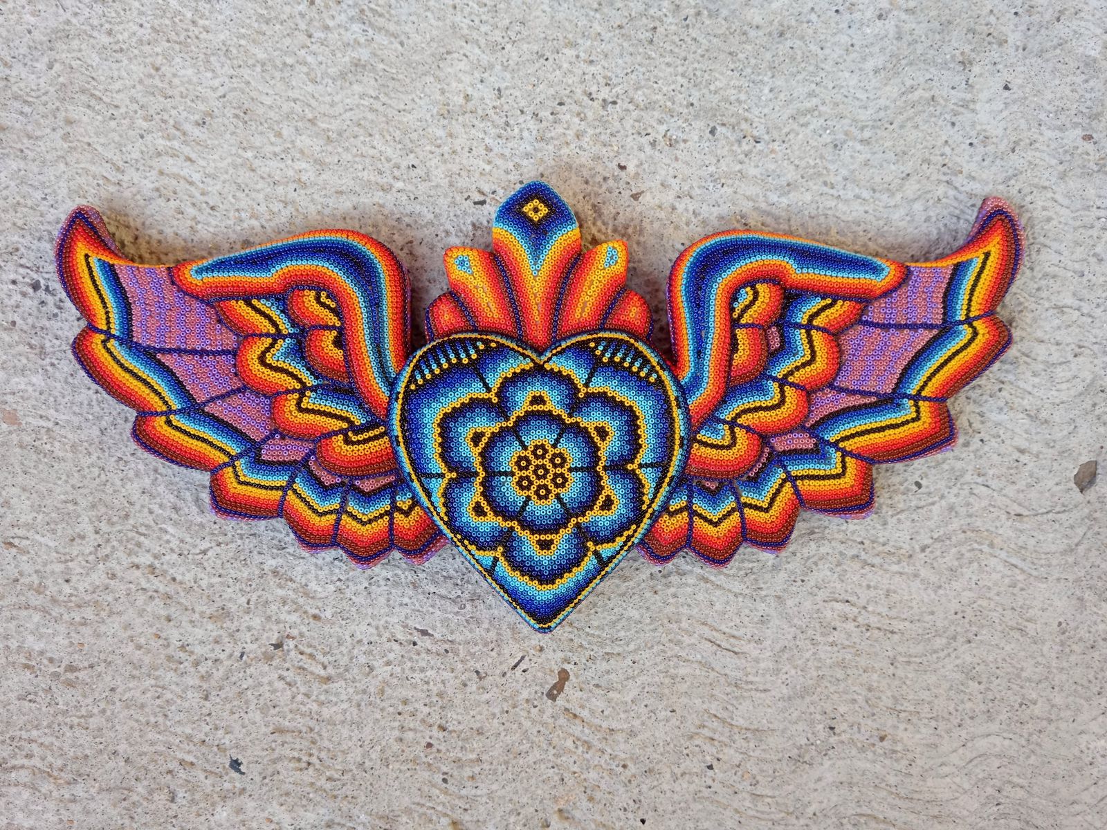 Huichol Hand Beaded Mexican Folk Art Heart with Wings By Santos Bautista PP8491