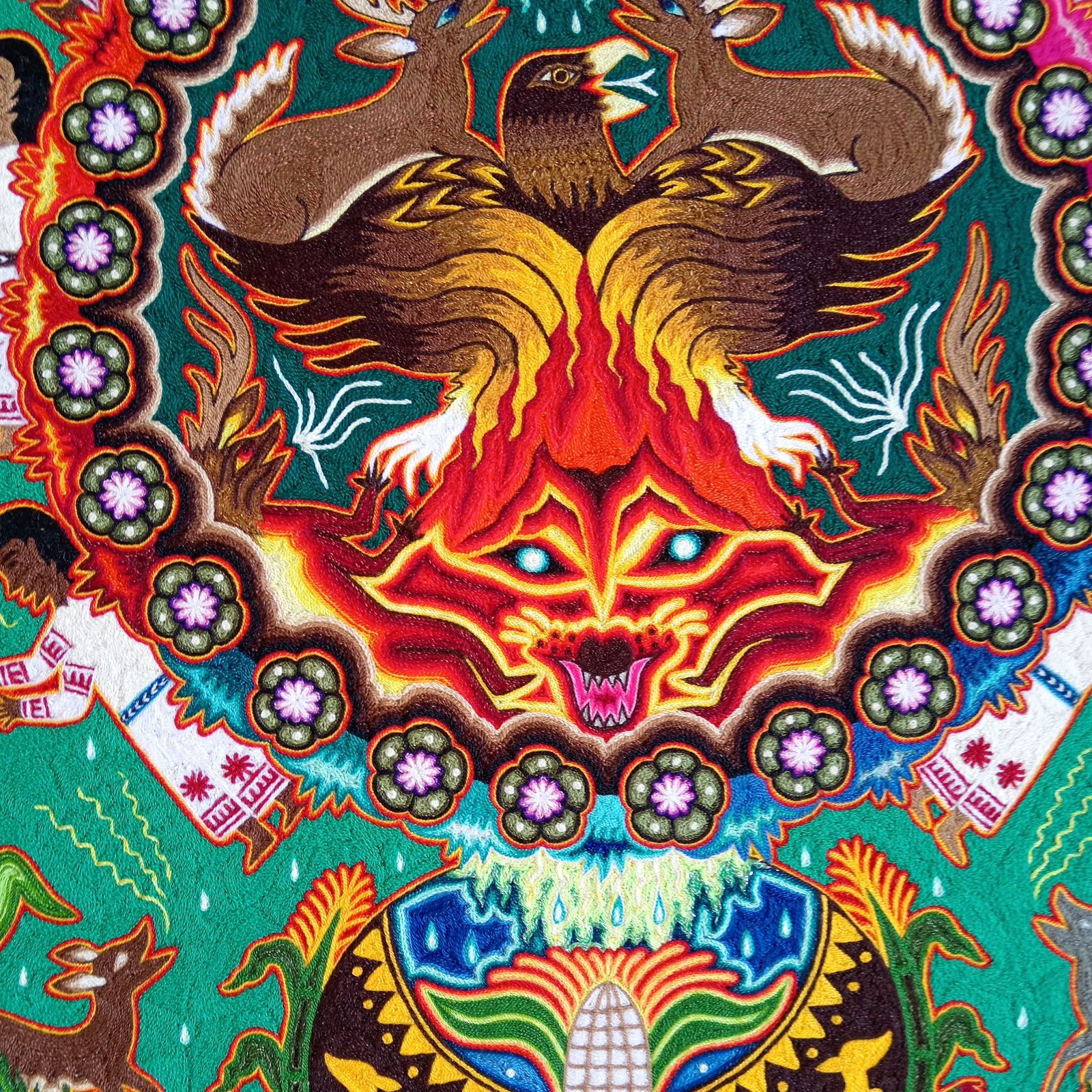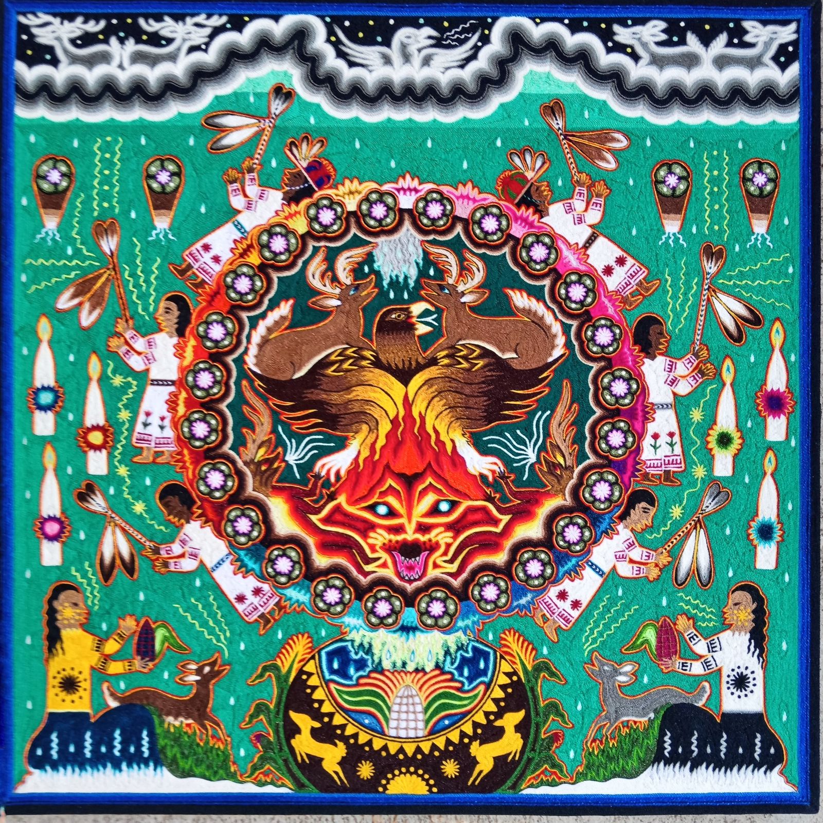 This is an extraordinary yarn painting that measures 24" x 24". Samuel Hernandez Cosio is the son of Gonzalo Hernandez one of the pionerrs of the yarn art who learned his trade from Mariano Valadez and the Huichol Center for Cultural Survival.