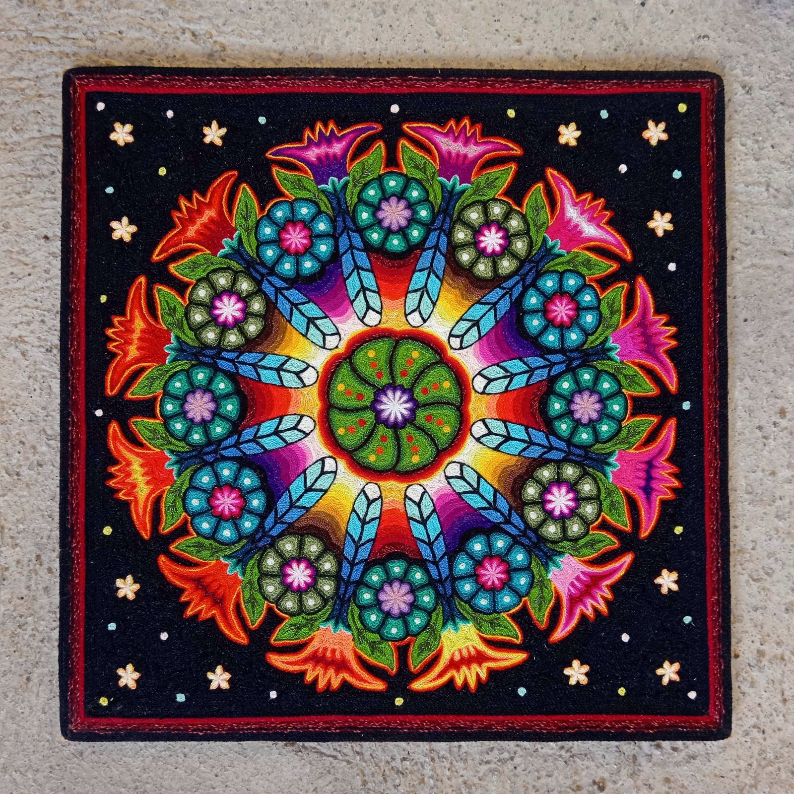 This is an extraordinary yarn painting that measures 12" x 12". Samuel Hernandez Cosio is the son of Gonzalo Hernandez one of the pionerrs of the yarn art who learned his trade from Mariano Valadez and the Huichol Center for Cultural Survival.