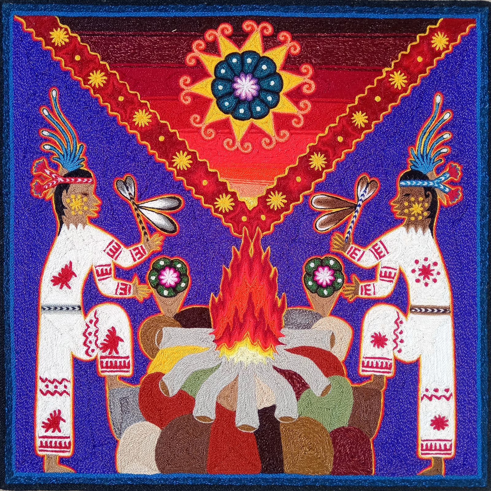 As a student, Samuel learned the value of utilizing the finest threads on the market to create incredibly detailed yarn paintings that reflect his cultures customs and traditions as well as his own visions from consuming peyote during ceremony.