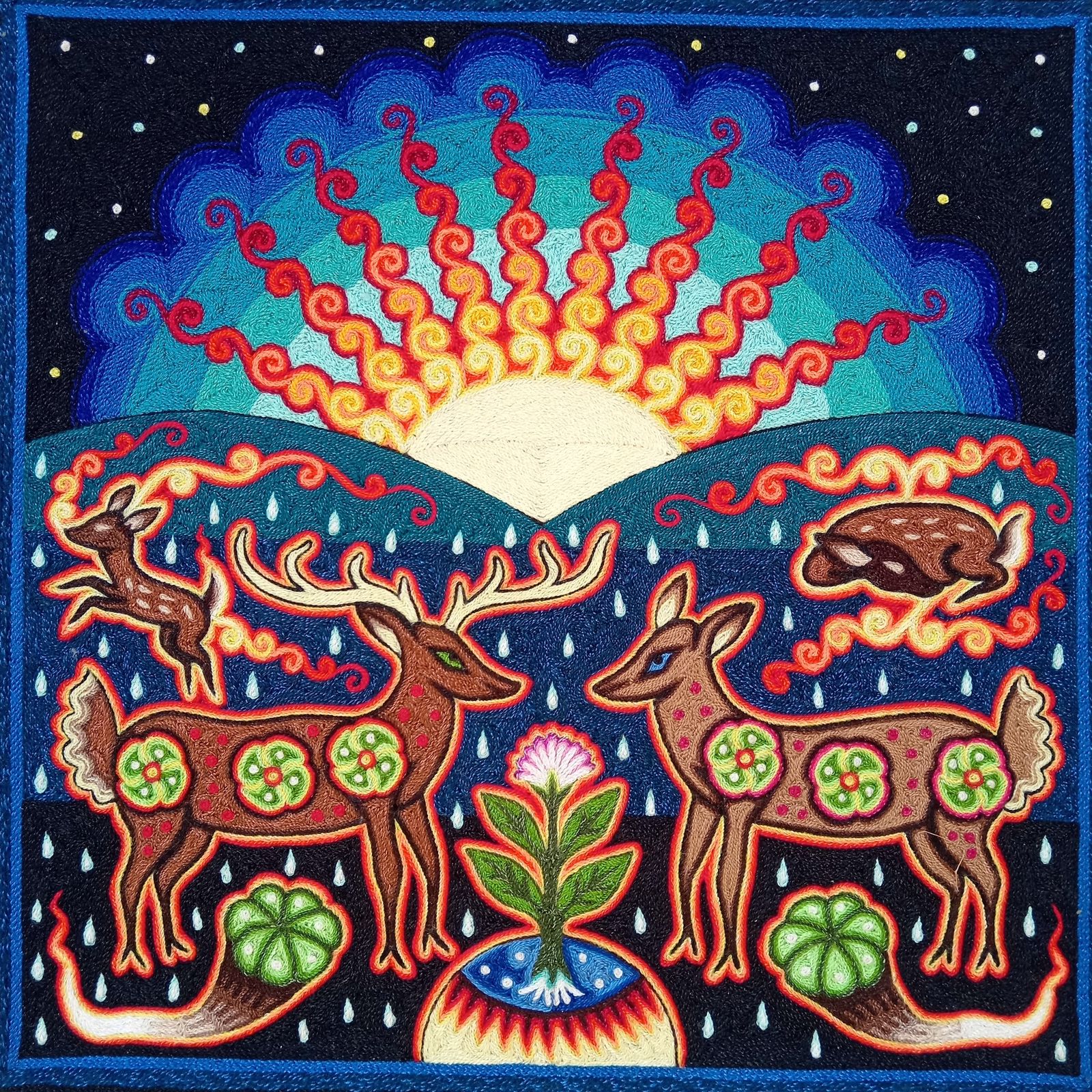 This is an extraordinary yarn painting that measures 12" x 12". Samuel Hernandez Cosio is the son of Gonzalo Hernandez one of the pionerrs of the yarn art who learned his trade from Mariano Valadez and the Huichol Center for Cultural Survival.