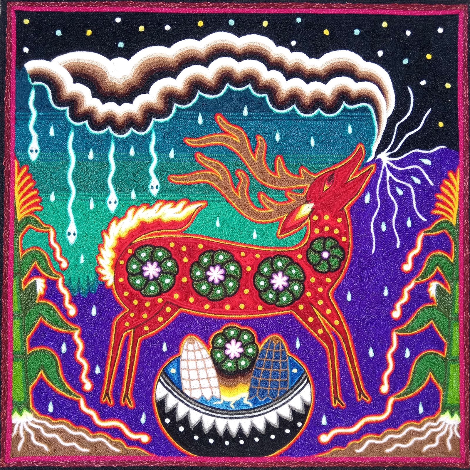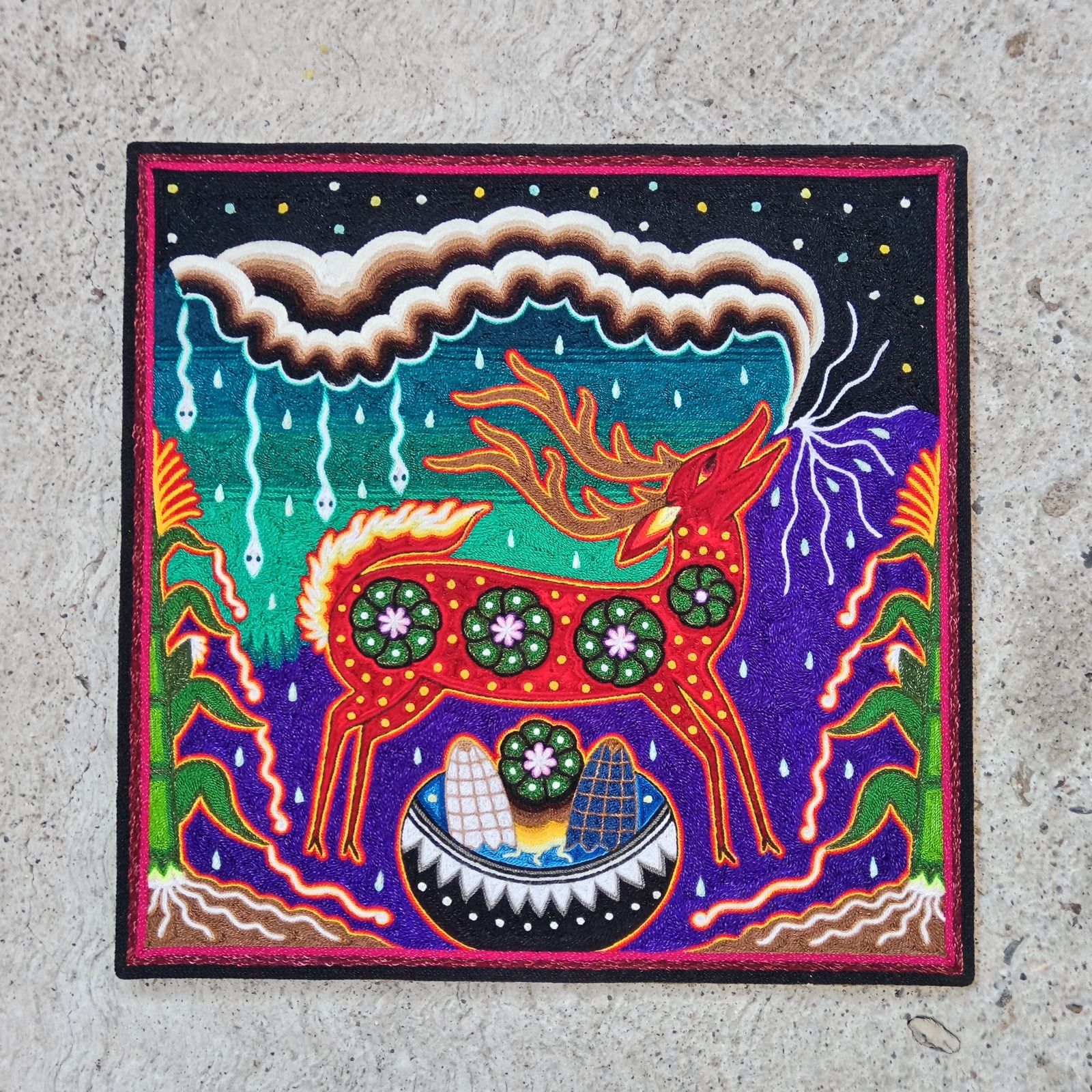 This is an extraordinary yarn painting that measures 12" x 12". Samuel Hernandez Cosio is the son of Gonzalo Hernandez one of the pionerrs of the yarn art who learned his trade from Mariano Valadez and the Huichol Center for Cultural Survival.