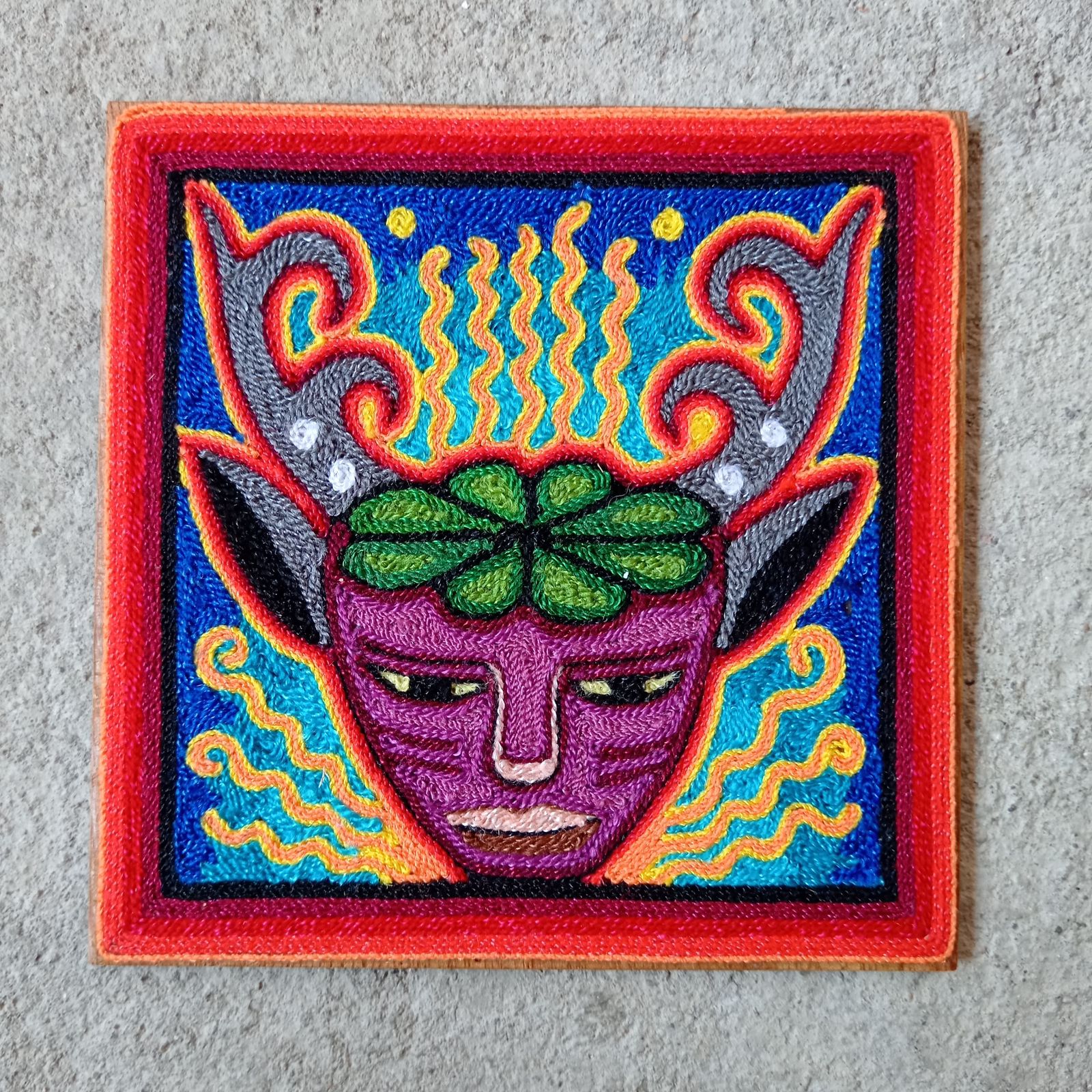 This is an extraordinary Yarn painting that measures 6" x 6". For years most Huichol have been content to follow the footsteps of their ancestors doing the same yarn painting over and over again until one artist named Neikame came along.