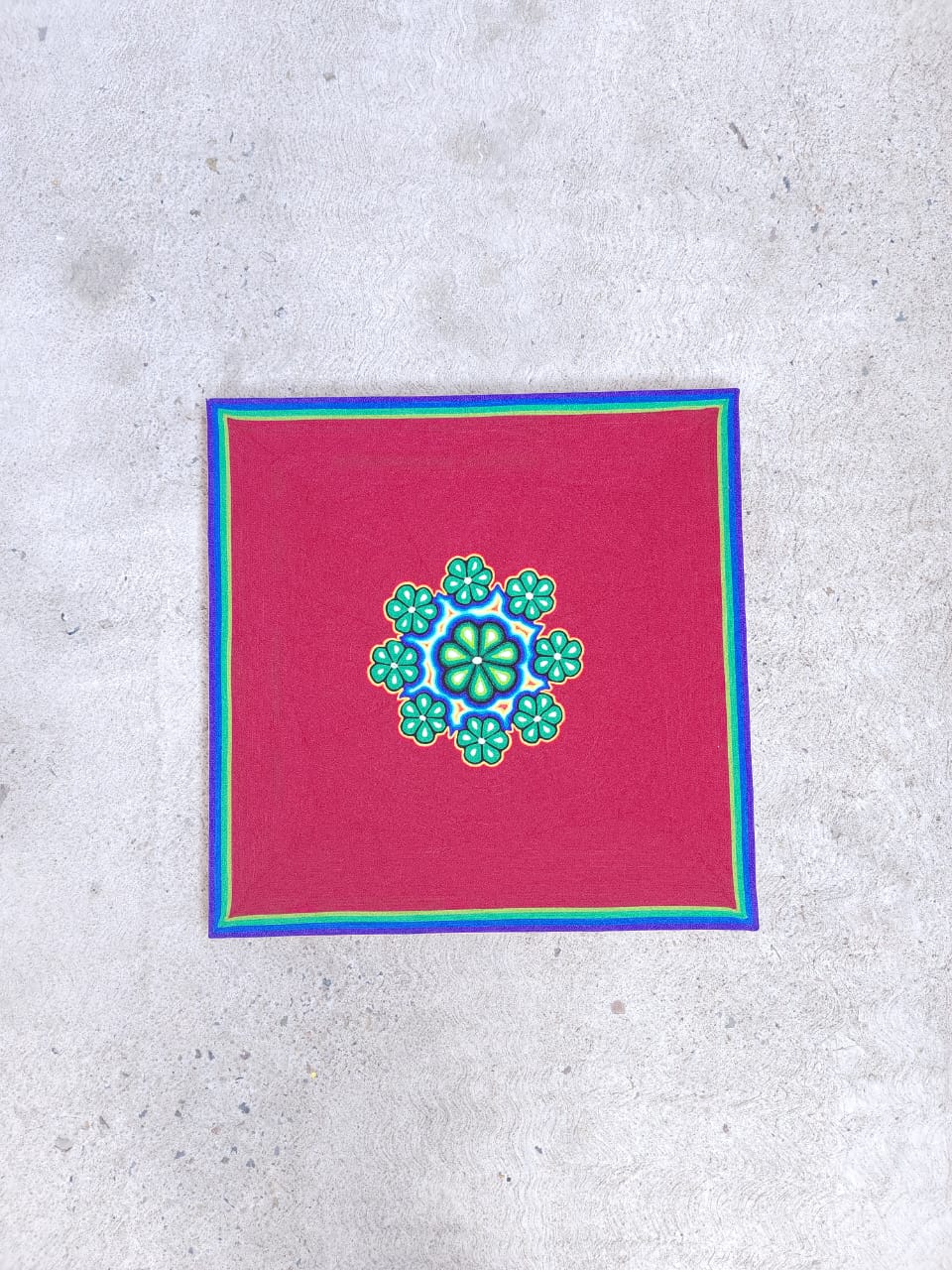 This is an extraordinary yarn painting is a classic Wixarika (Huichol) people are internationally acclaimed for their artwork. This piece is adorned with symbology from their culture. His artwork represents the visions experienced by the shamans.