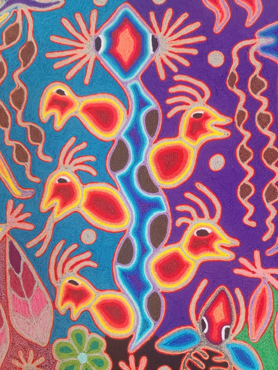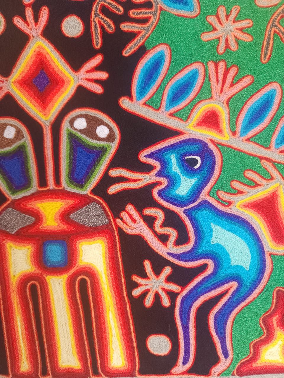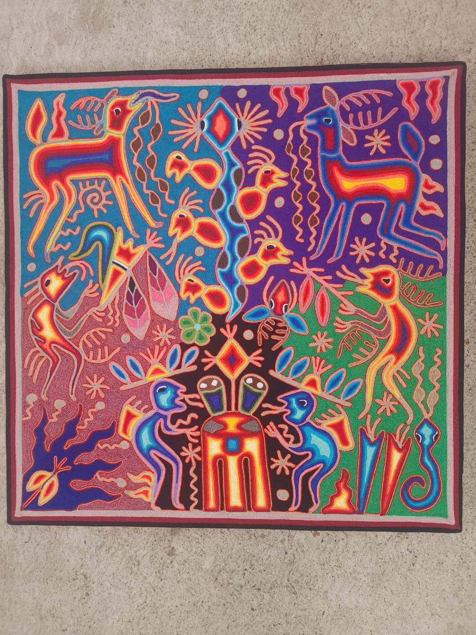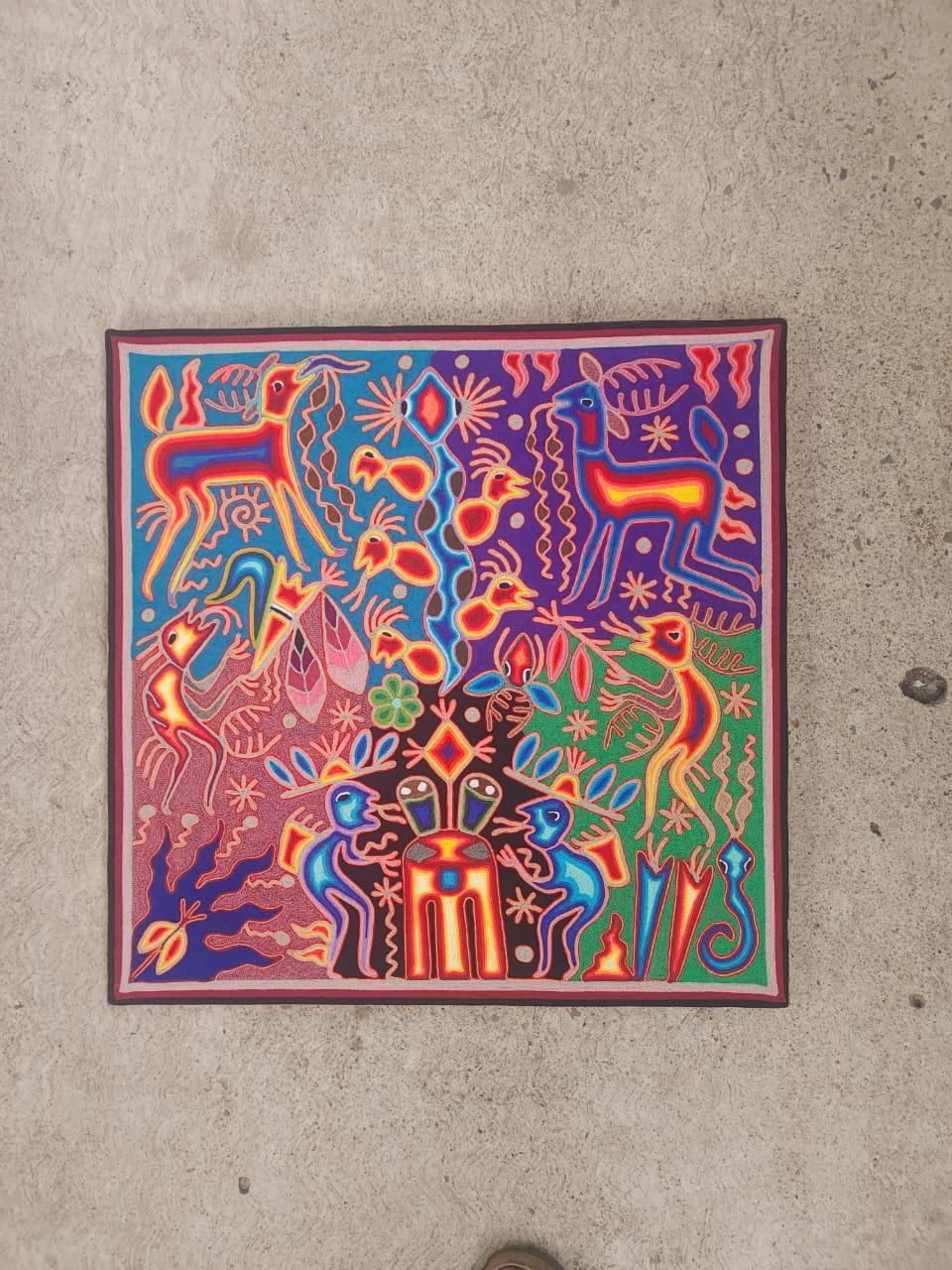 This is an extraordinary yarn painting is a classic Wixarika (Huichol) people are internationally acclaimed for their artwork. This piece is adorned with symbology from their culture. His artwork represents the visions experienced by the shamans.