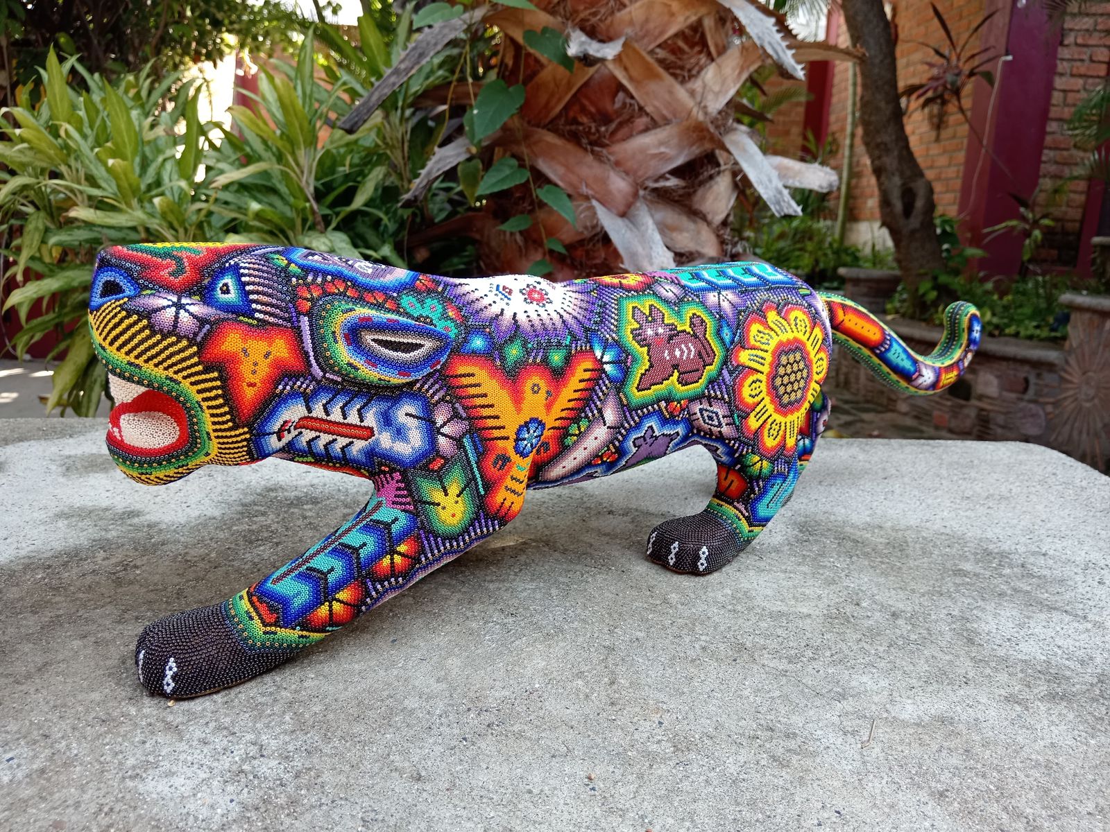Mexican Folk Art Huichol Beaded Jaguar By Isandro Villa Lopez PP7358