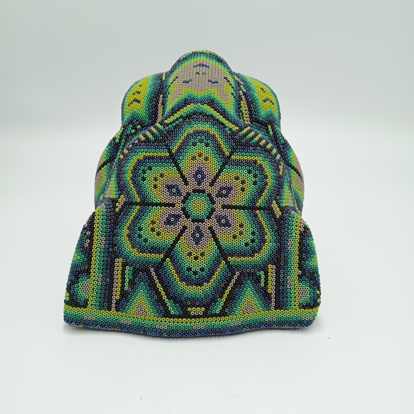 The piece By Mayola Villa Lopez is the grandson of Jacinto Lopez Ramirez, an older Huichol shaman considered to be the grandfather of the commercial bead art. Honorio lives in Agua Zarca the families ranch about 2 hours from San Andres Cohamiata the ancient Ceremonial Center deep in the Sierra Madre Mountains of Western Mexico.