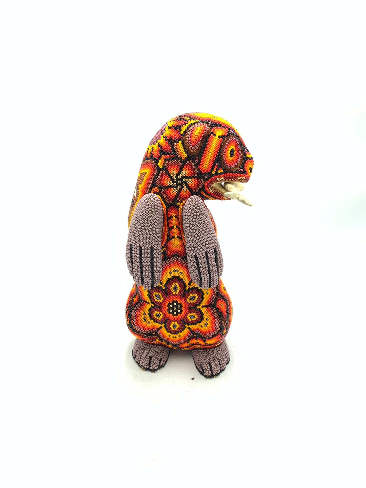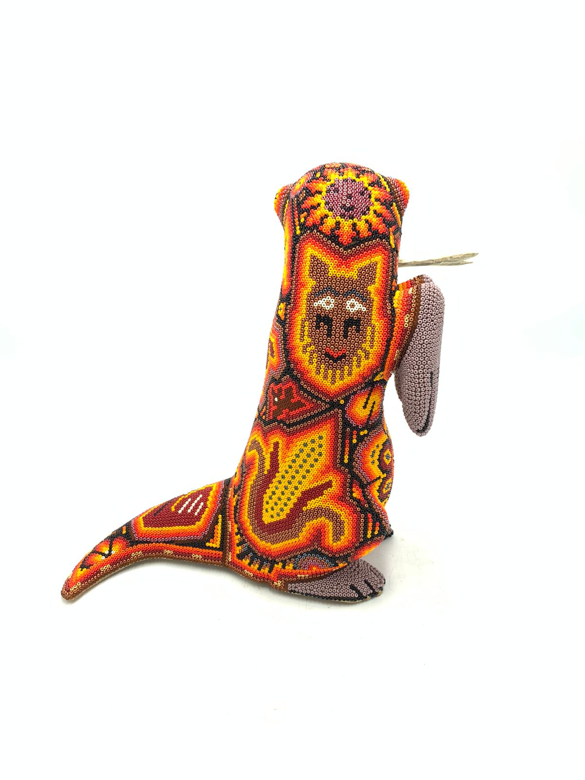The Wixarika (Huichol) people are internationally acclaimed for their artwork. This piece is adorned with symbology from their culture.