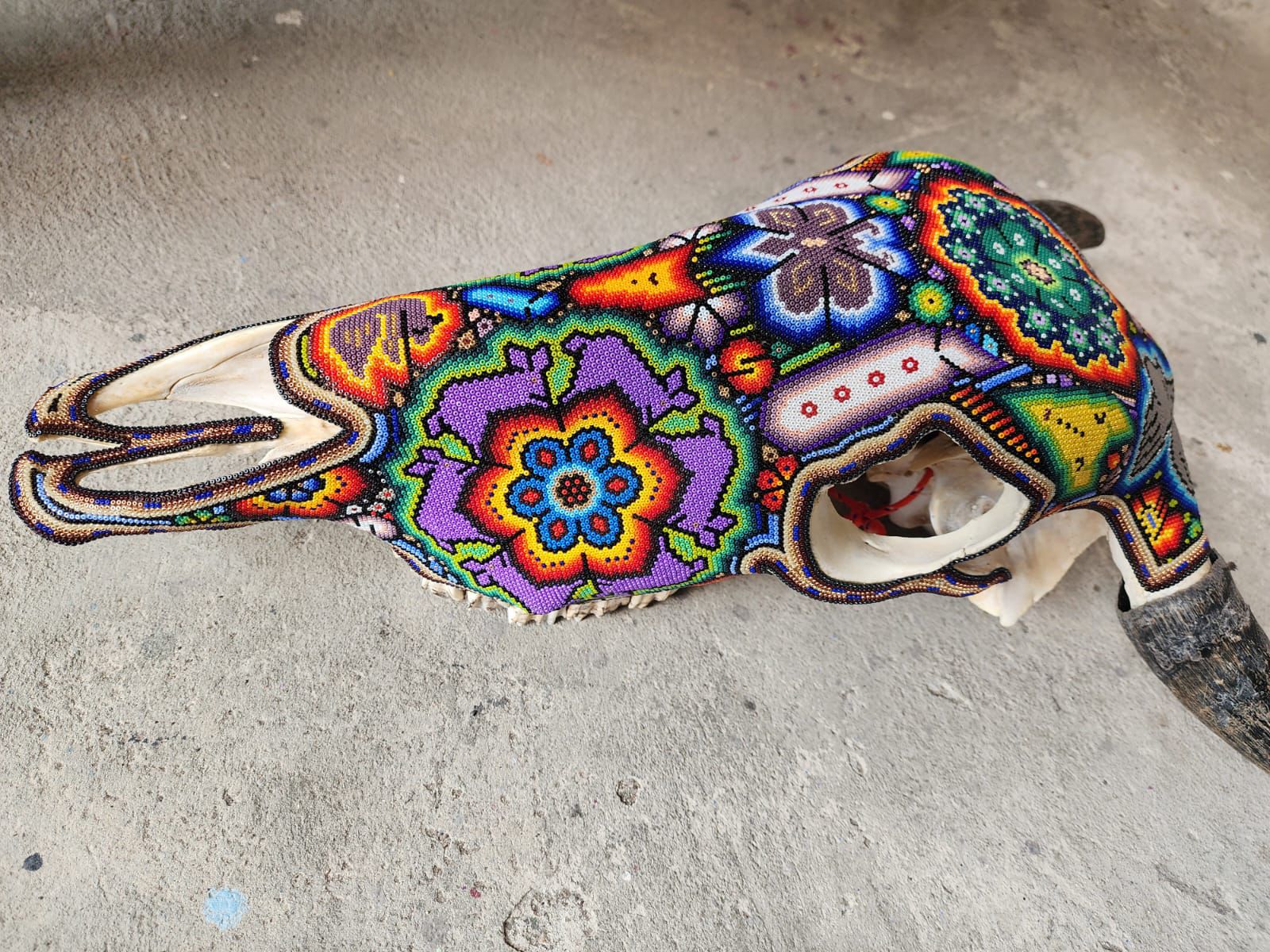 This is a huge hand beaded skull that measures 16" wide from horn to the the other horn, 25" from the tip of the horn to the tip of the nose, 22" from the top of the head to the tip of the nose and is 7.5" wide across the eyes.
