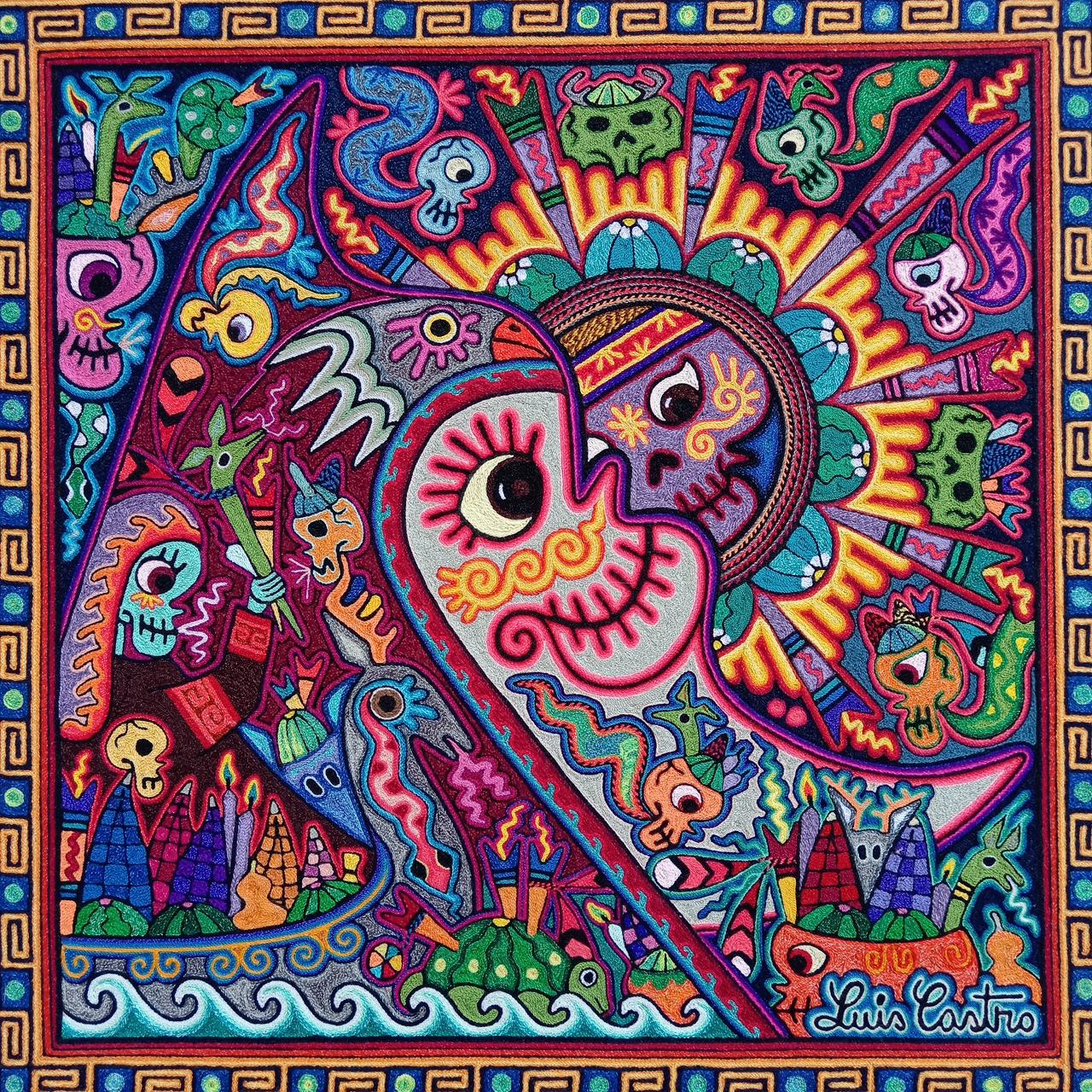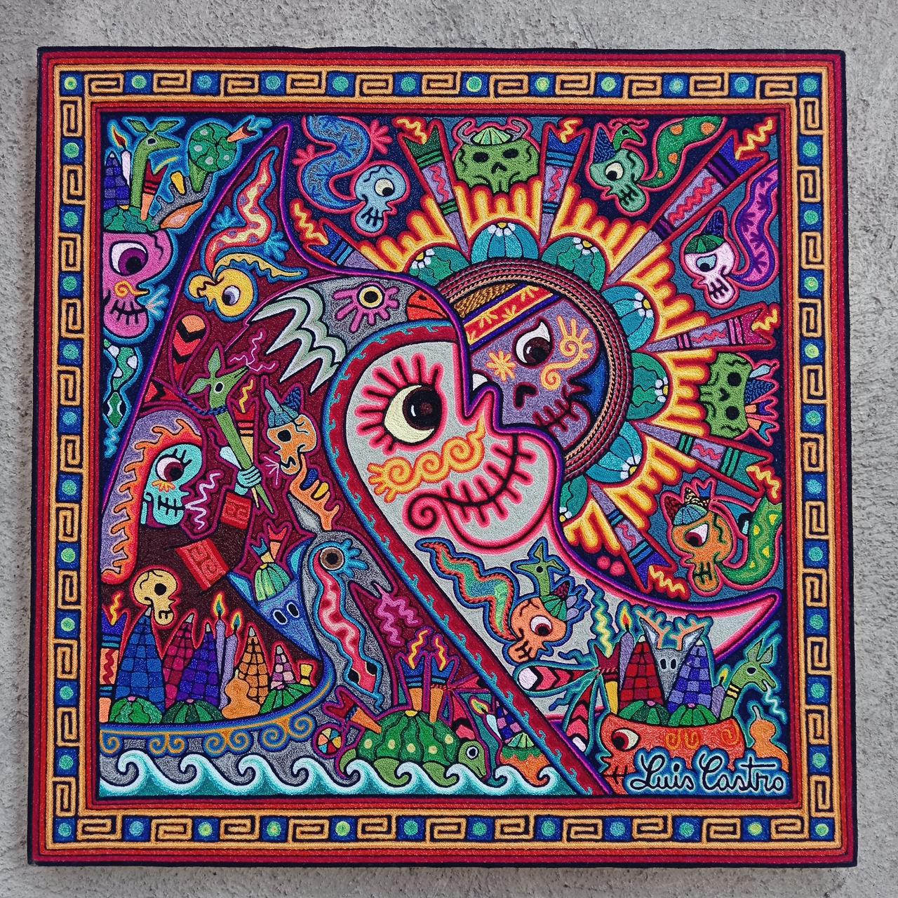 Mexican Folk Art Huichol Indian Yarn Painting by Luis Castro PP8048