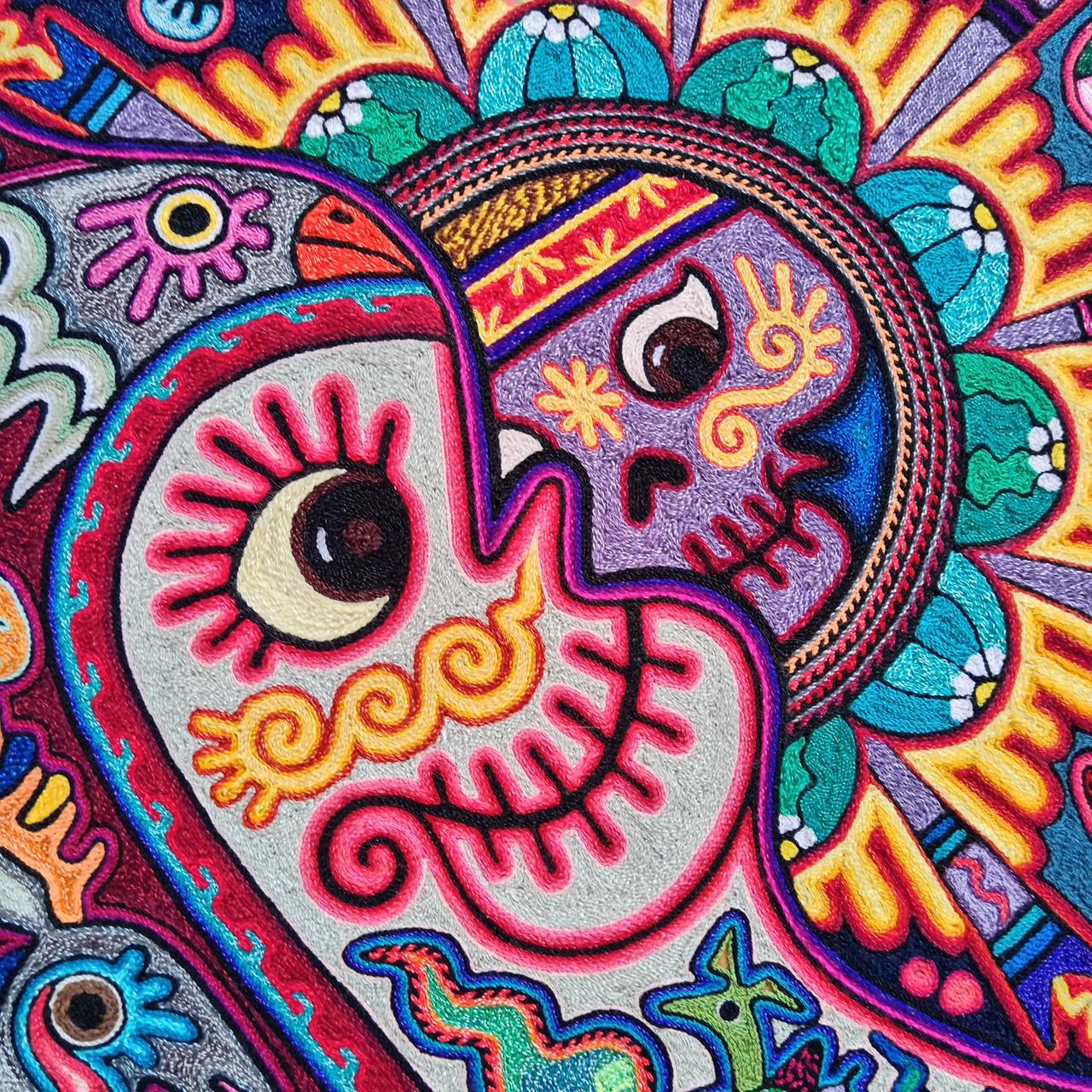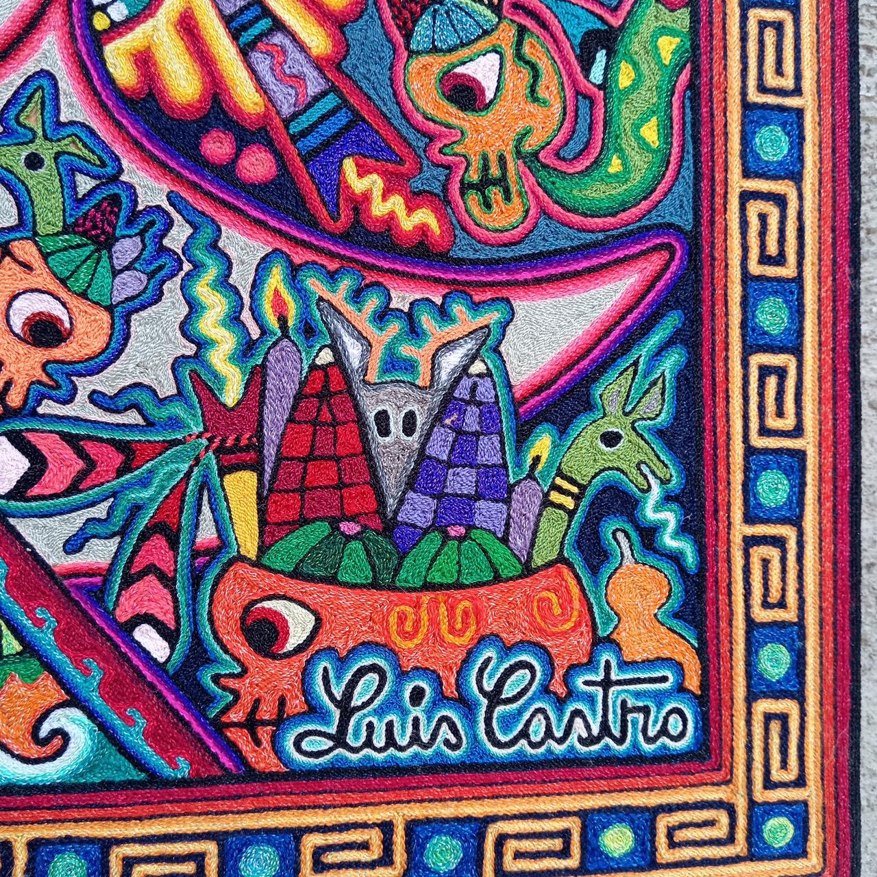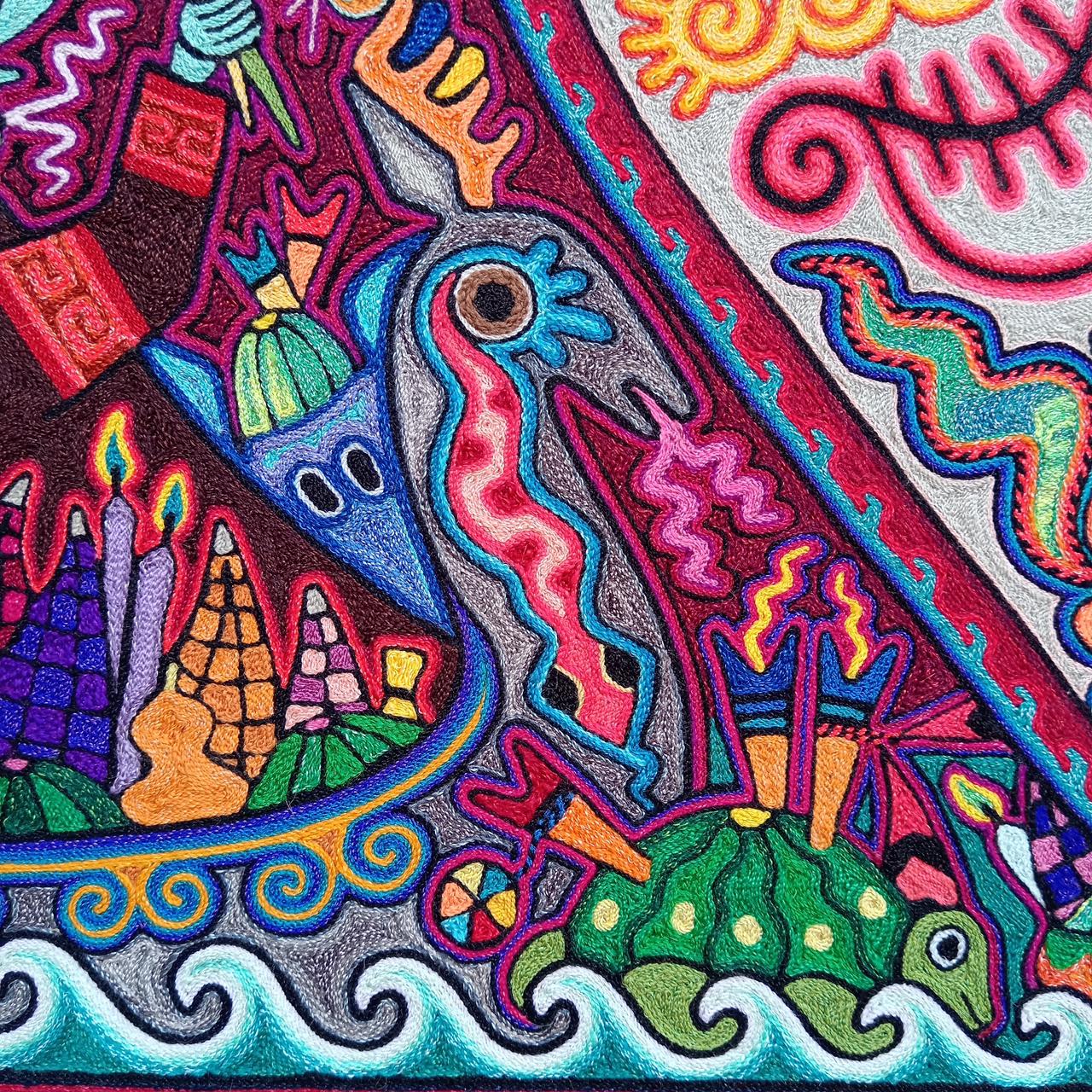 This is an extraordinary yarn painting that measures 24" x 24". The artist, Luis Castro comes from one of the most important families in Huichol art. His great grandfather Hilario Castro was a well respected shaman in the late 1960's, his grandfather Daniel Castro was one of the pioneers of the yarn art in the 1970's and his father is one of the best recognized yarn artist and recently placed 2nd in the Nayarit State Art competition.