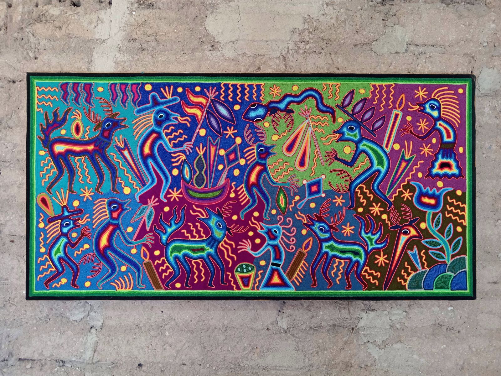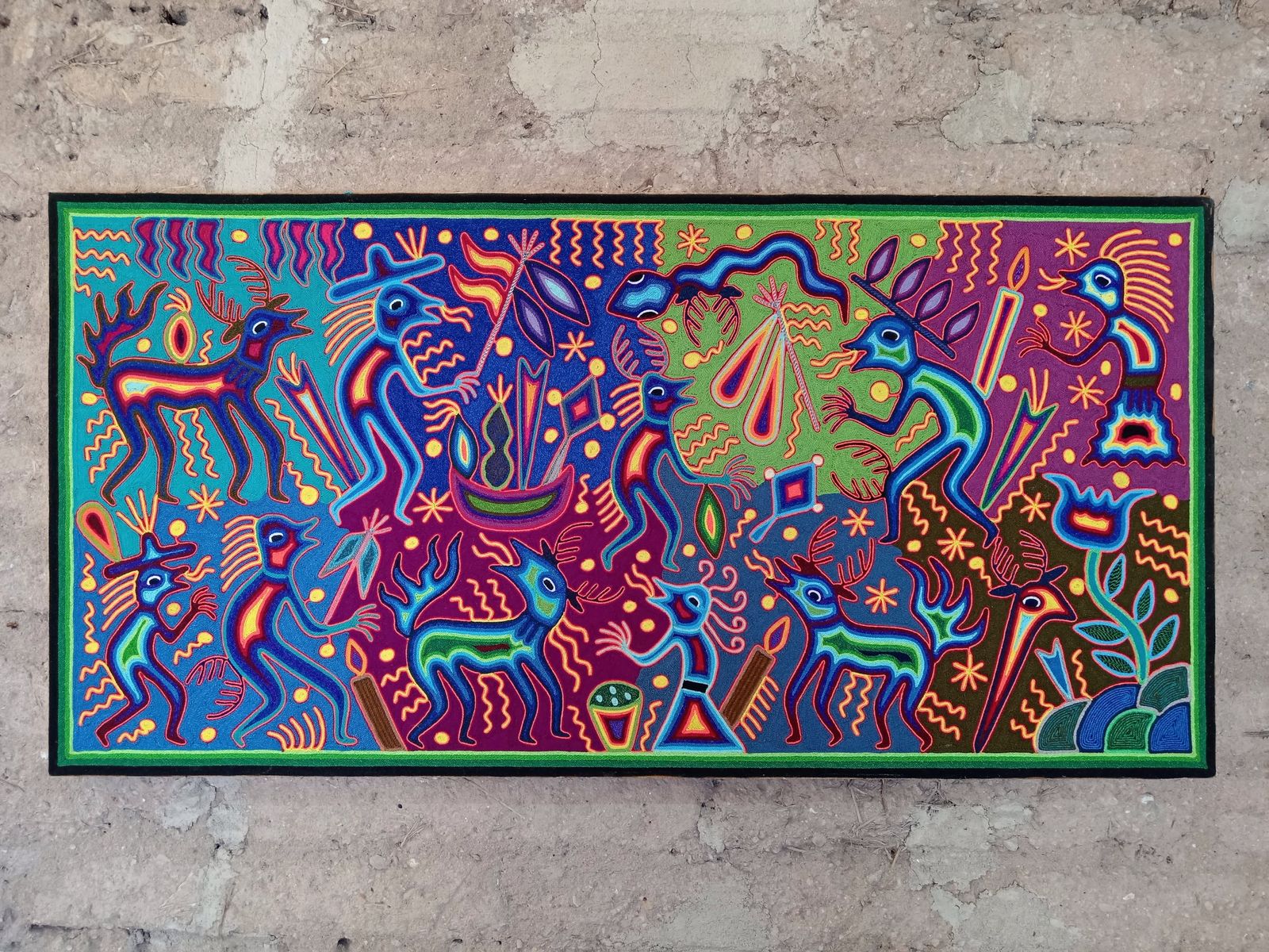 This is an extraordinary yarn painting that measures 48"x 24". The Wixarika (Huichol) people are internationally acclaimed for their artwork. This piece is adorned with symbology from their culture.