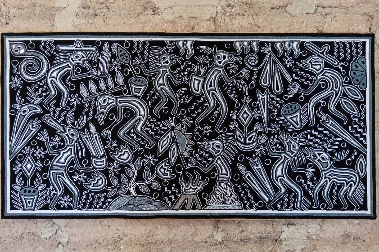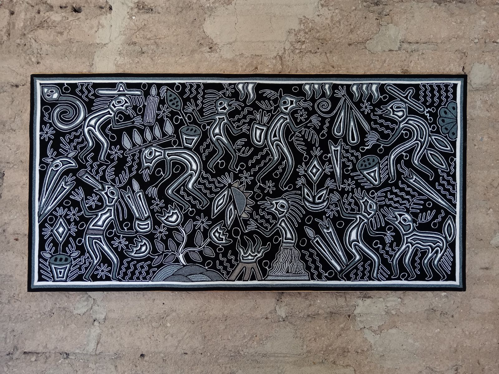 This is an extraordinary yarn painting that measures 48"x 24". The Wixarika (Huichol) people are internationally acclaimed for their artwork. This piece is adorned with symbology from their culture.
