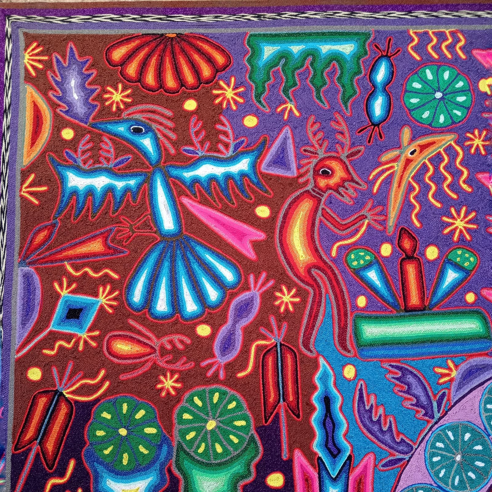 This is an extraordinary yarn painting that measures 48"x 48". The Wixarika (Huichol) people are internationally acclaimed for their artwork. This piece is adorned with symbology from their culture.