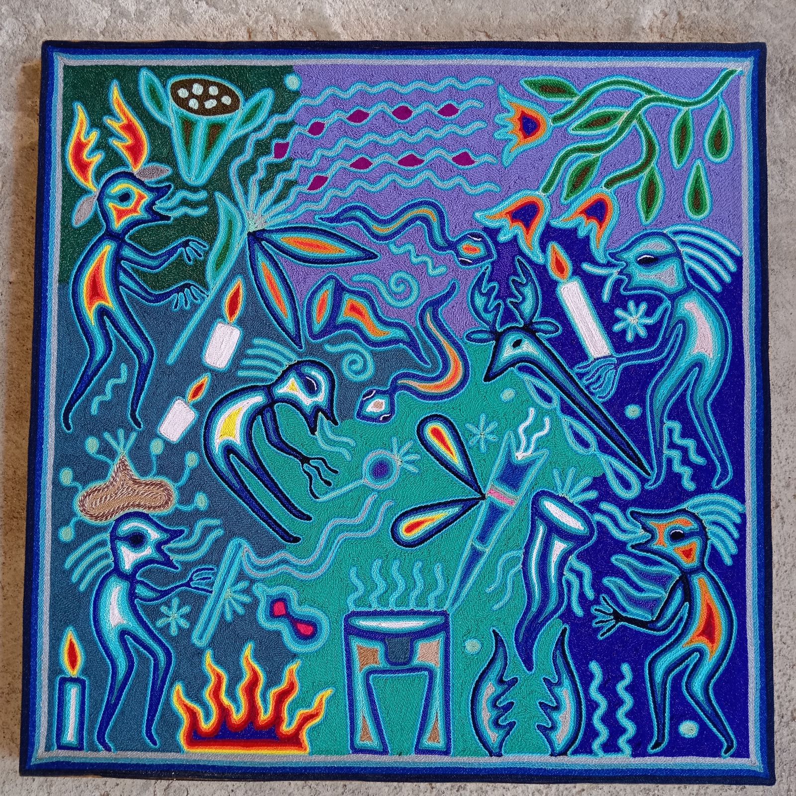 This is an extraordinary yarn painting that measures 24"x 24". The Wixarika (Huichol) people are internationally acclaimed for their artwork. This piece is adorned with symbology from their culture.