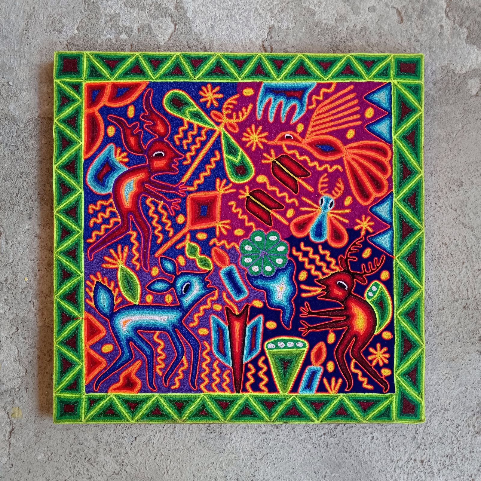 This is an extraordinary yarn painting that measures 24"x 24". The Wixarika (Huichol) people are internationally acclaimed for their artwork. This piece is adorned with symbology from their culture.
