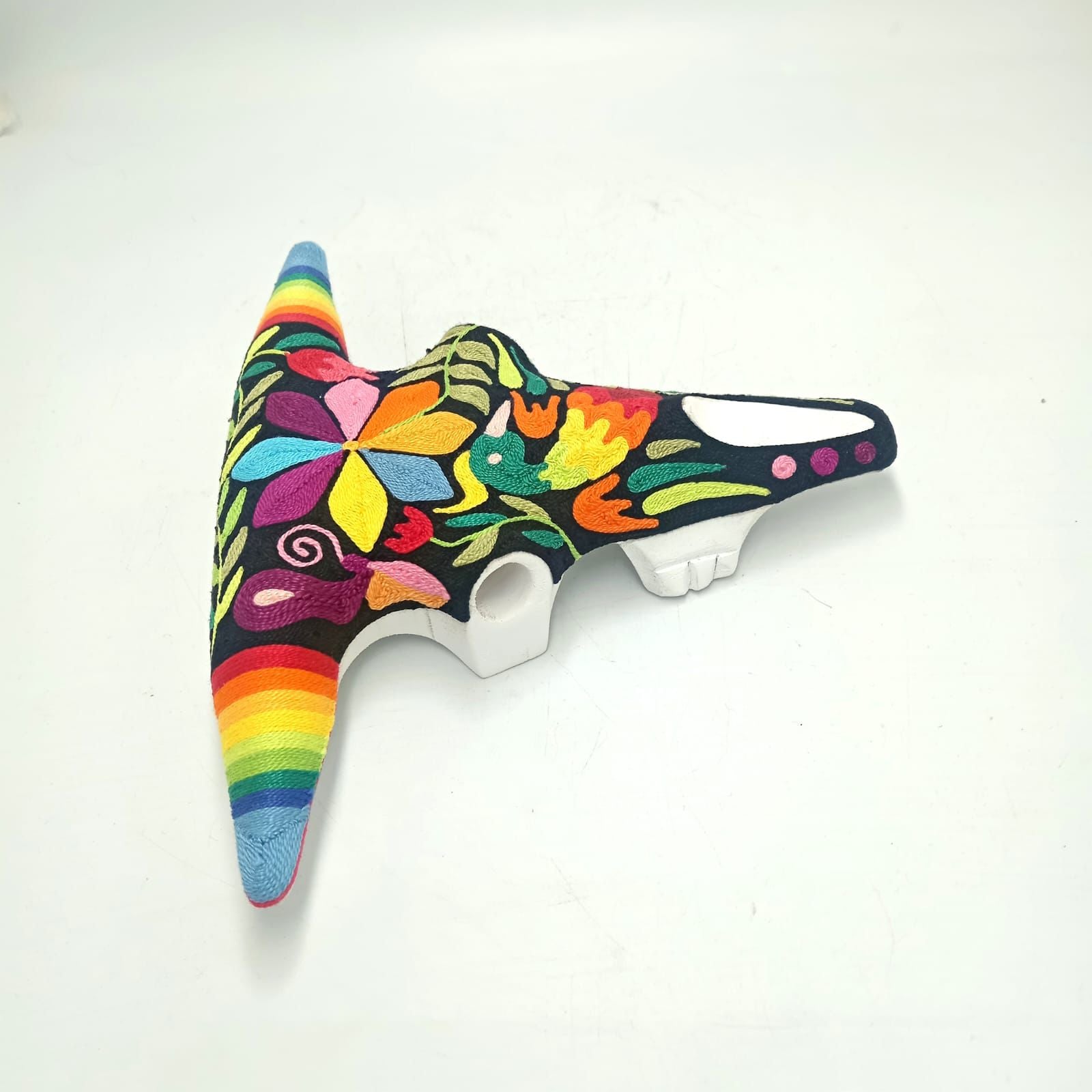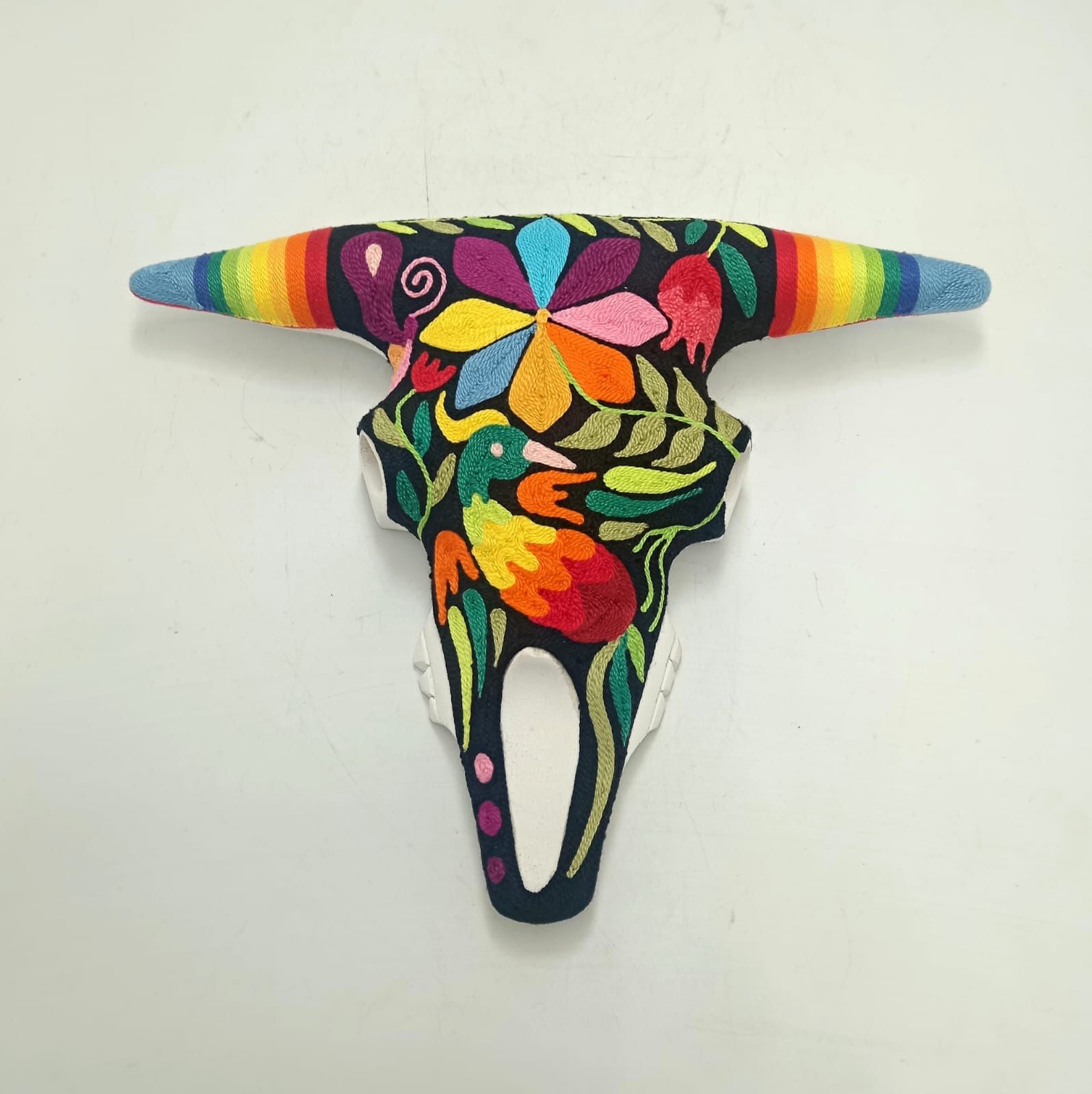 This is an extraordinary Yarn Painting on figure Bull Skull that Alfredo Meraz Reyna did that measures 10" from tip to tip of the horns, 9" from the tip of the horn to the end of the nose, 8" from the top to the end of the nose and is 4.5" wide from eye to eye.