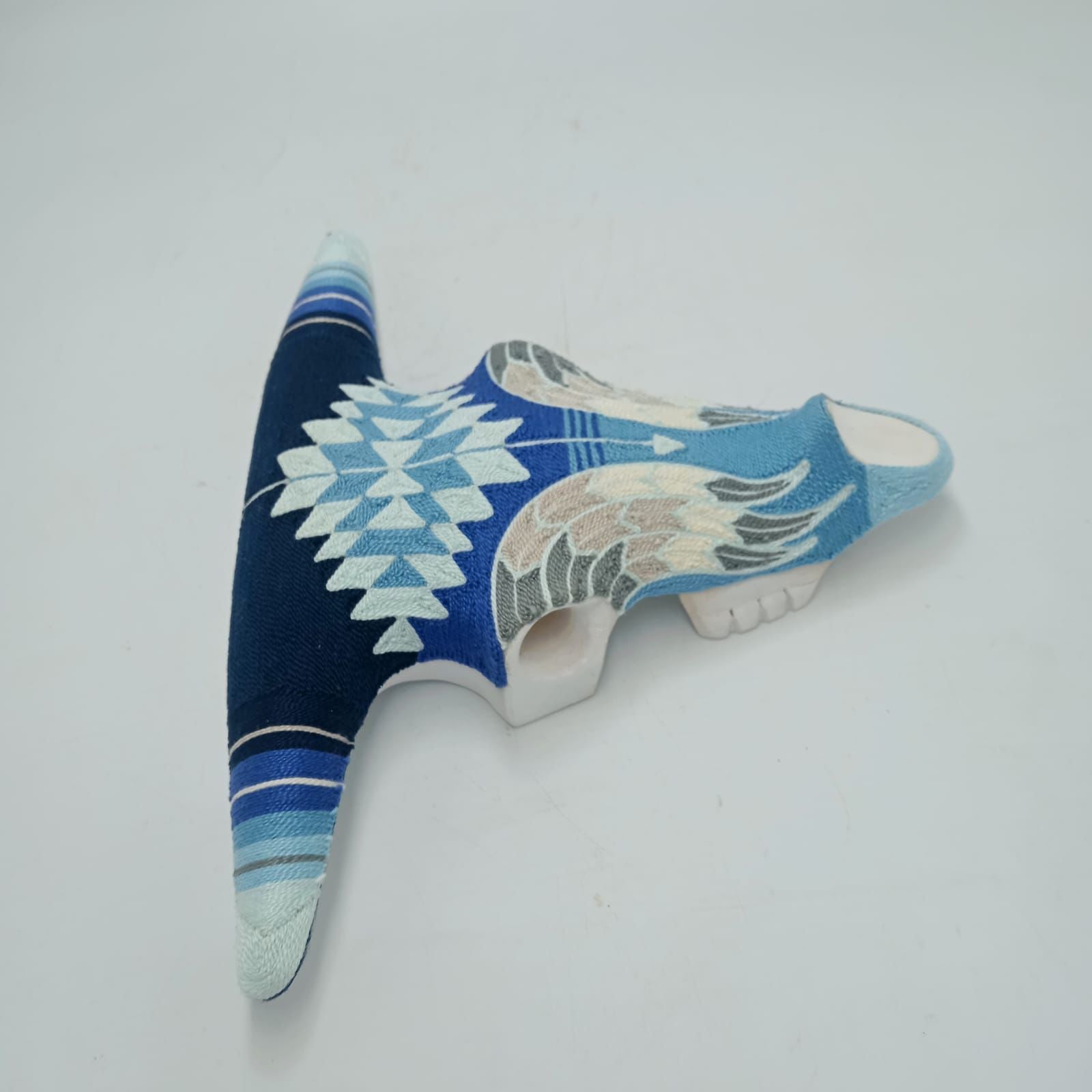 This is an extraordinary Yarn Painting on figure Bull Skull that Alfredo Meraz Reyna did that measures 10" from tip to tip of the horns, 9" from the tip of the horn to the end of the nose, 8" from the top to the end of the nose and is 4.5" wide from eye to eye.