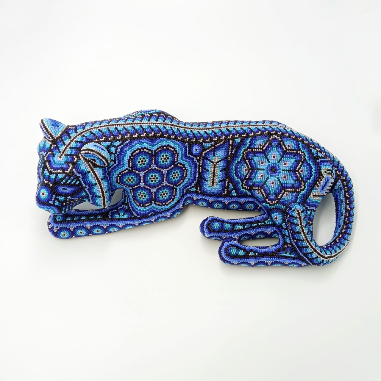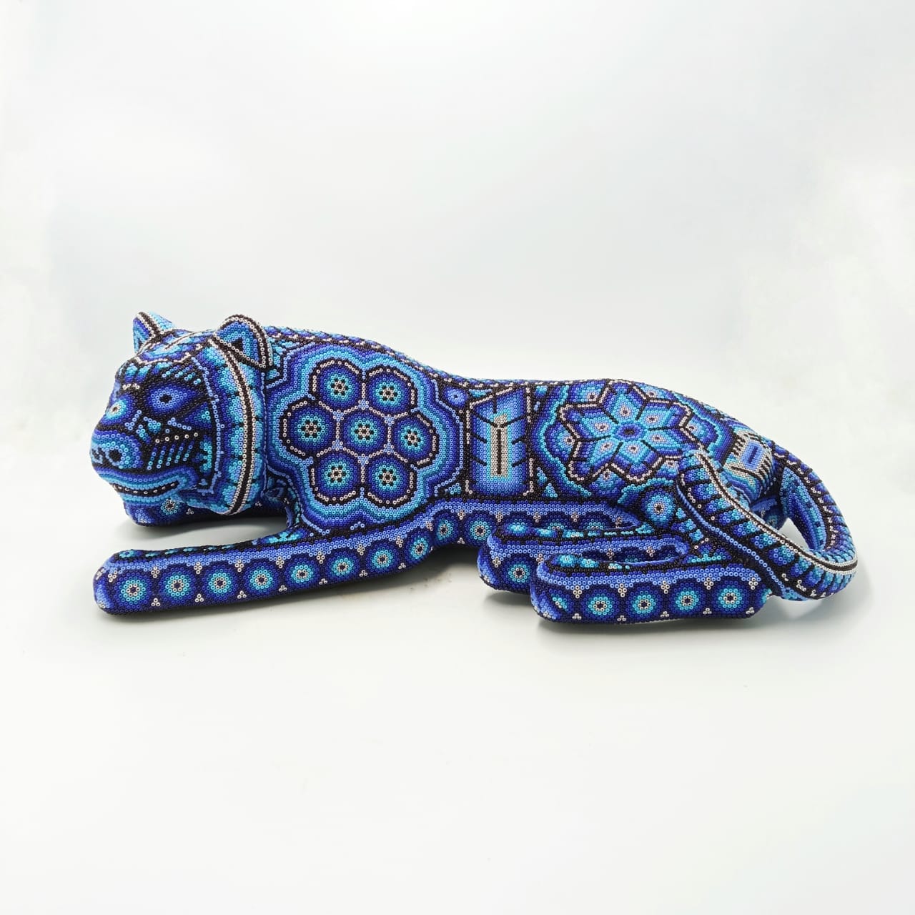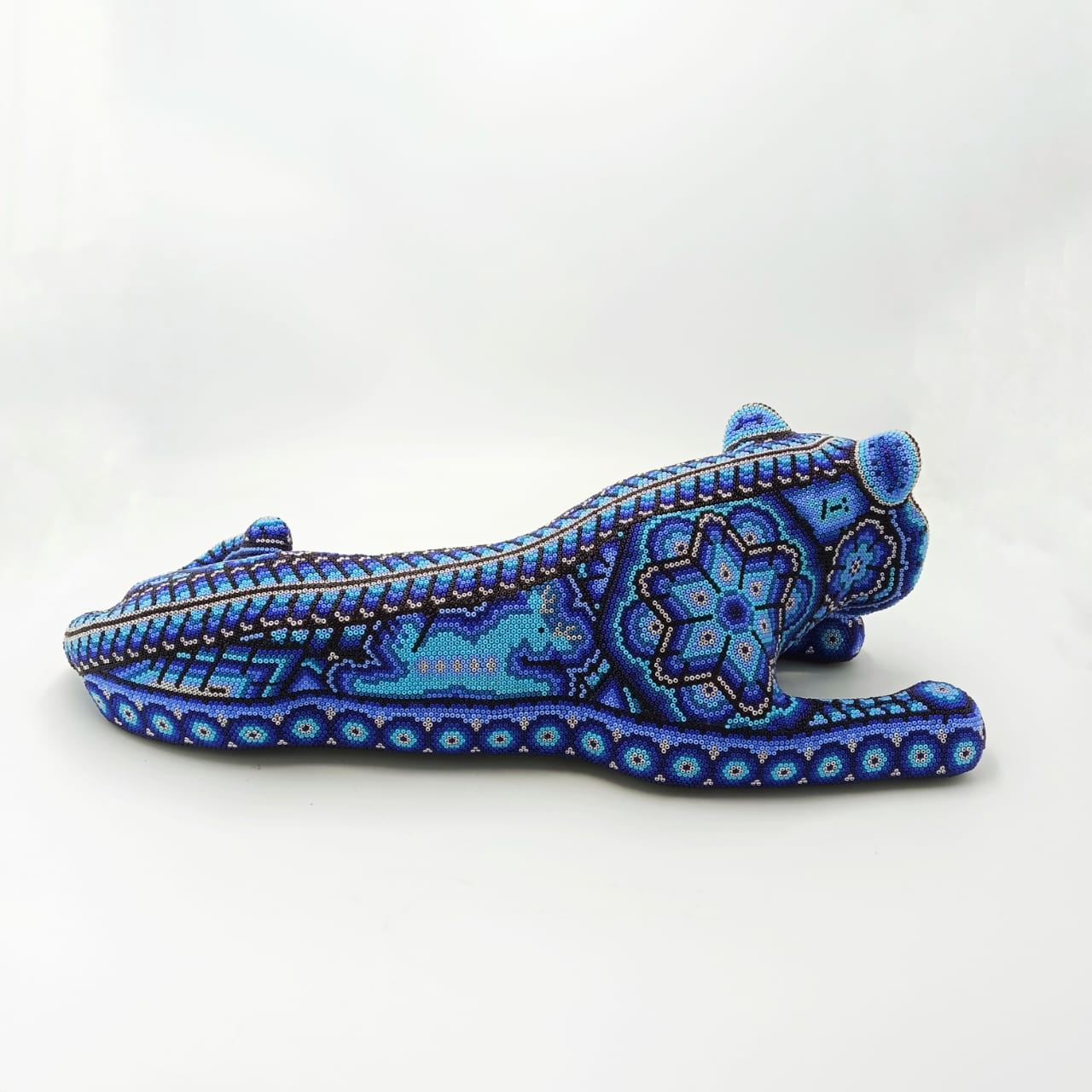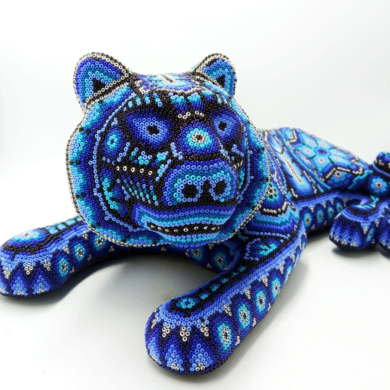 This piece Jaguar Paper Mache Form With Glass Beads Glued Pemanently With Expoxy Glue By Octaviano Lopez is a young who live in Agua Zarca a small ranch just outside of San Andres Cohamiata.