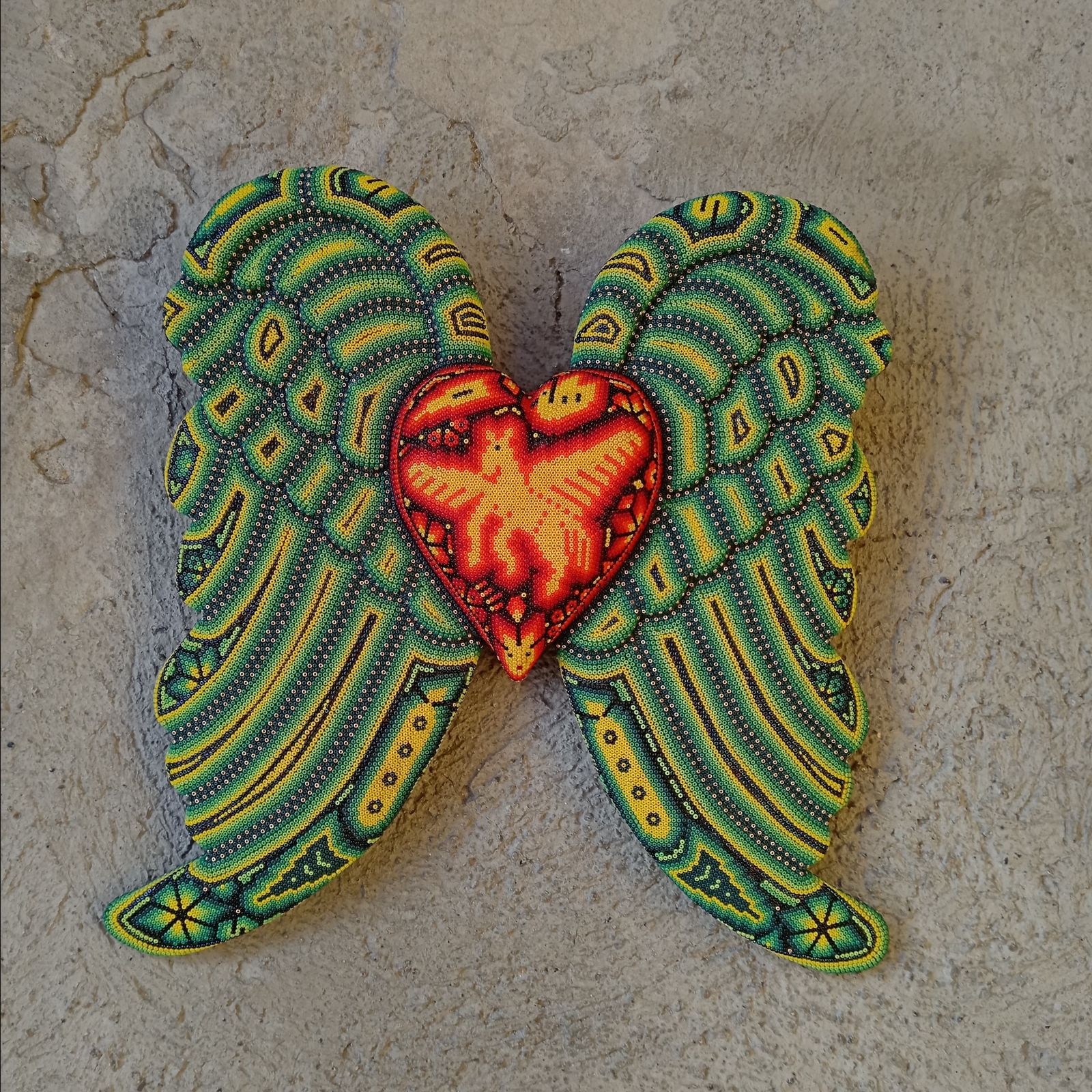 Mexican Huichol Hand Beaded Art, Heart with Wings By Isandro Villa Lopez PP8599