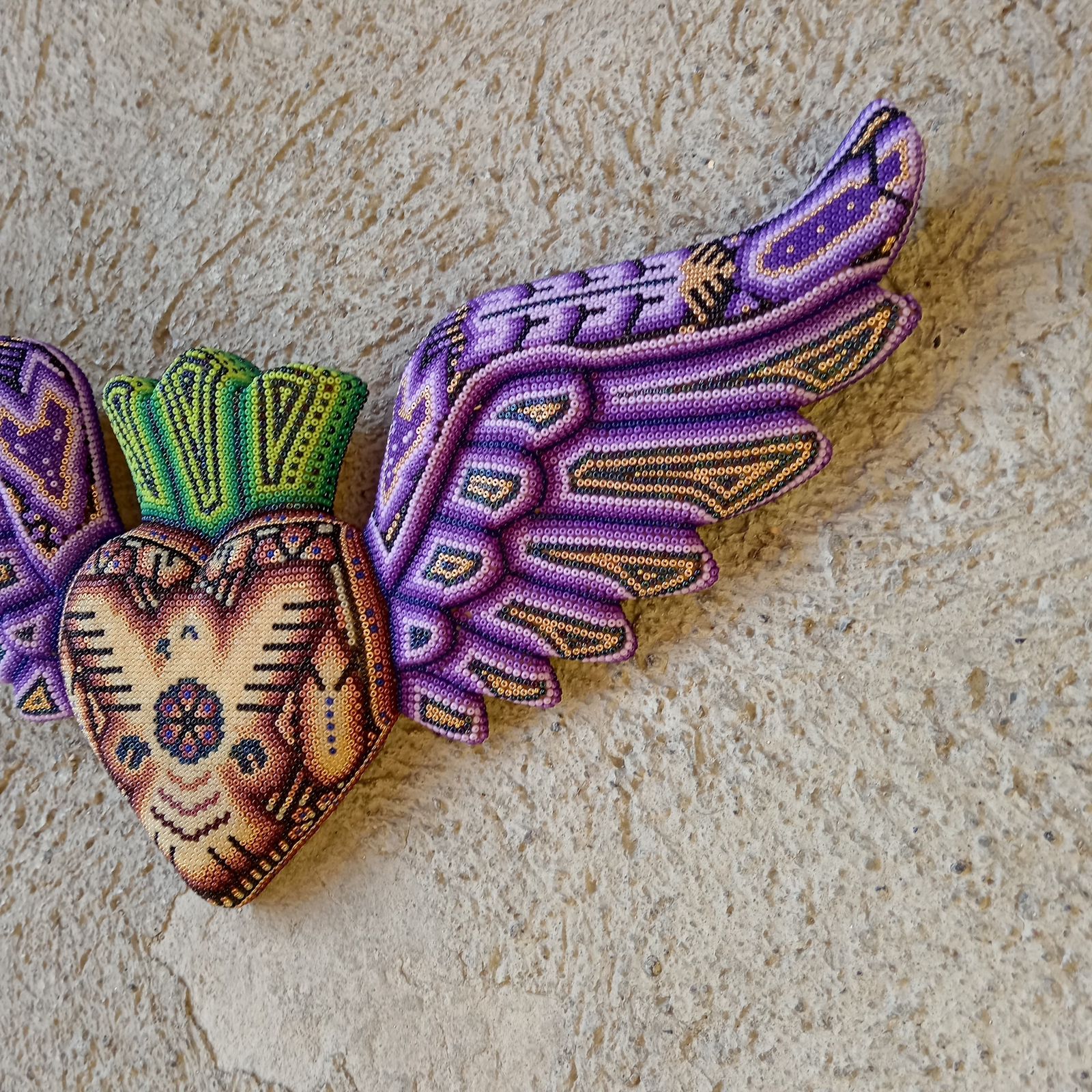 Mexican Huichol Hand Beaded Art, Heart with Wings By Isandro Villa Lopez PP8601