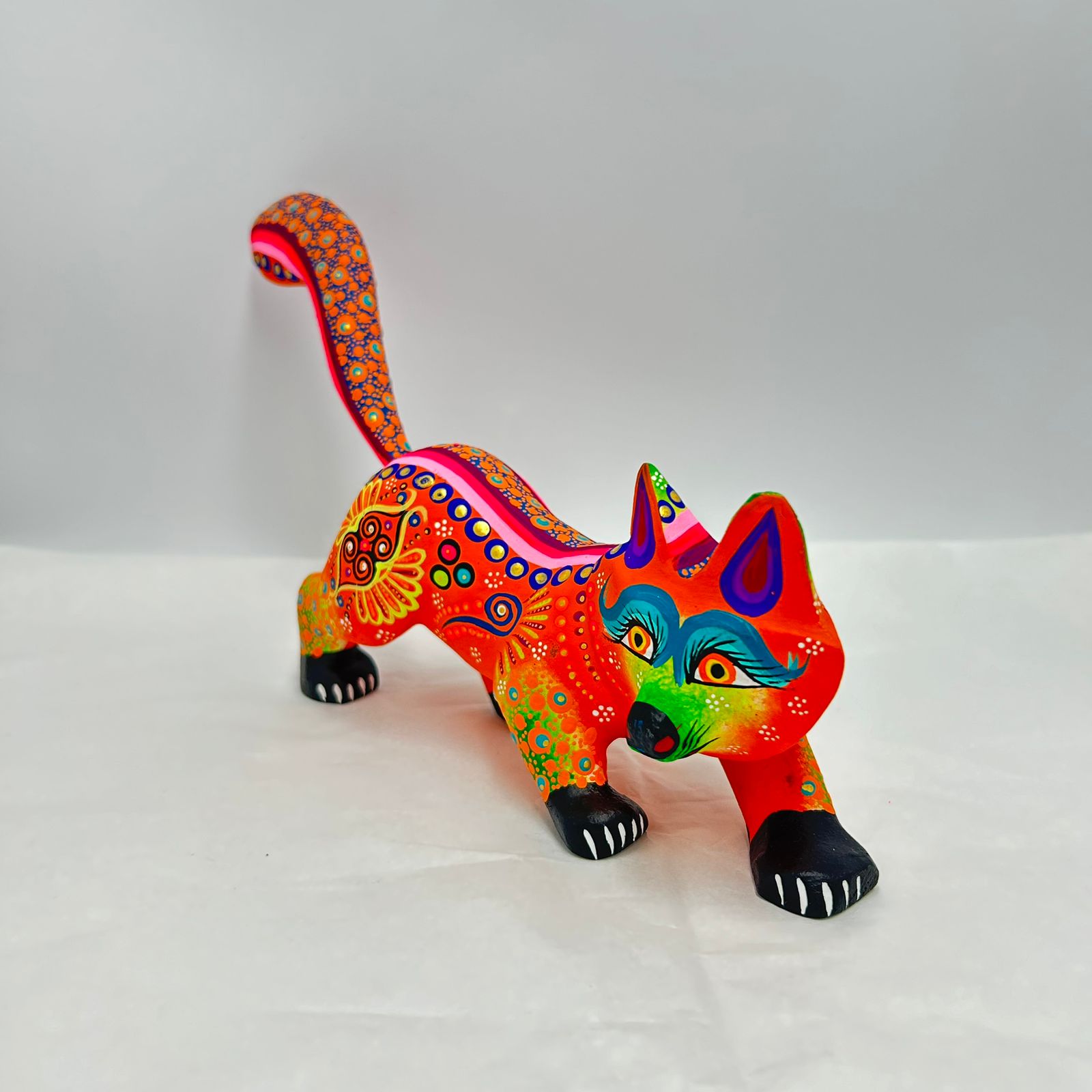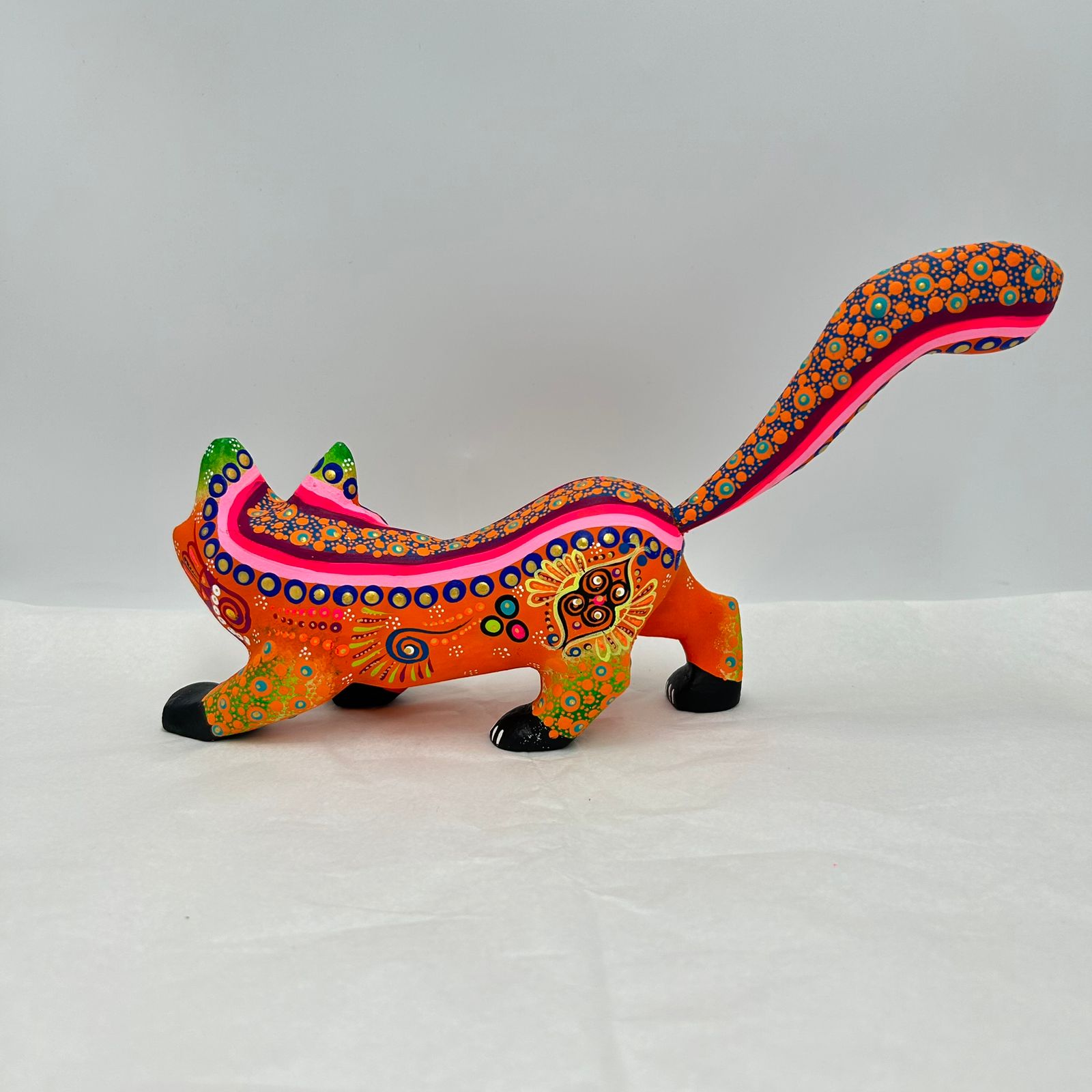 This piece comes from the town of San Martin Tilcajete, Oaxaca. This town specializes in the creation of fantastical wooden figures called alebrijes. He carves and paints all of his work, and his style has become very unique. His use of bright and vibrant colors make his artwork stand out in any decor.