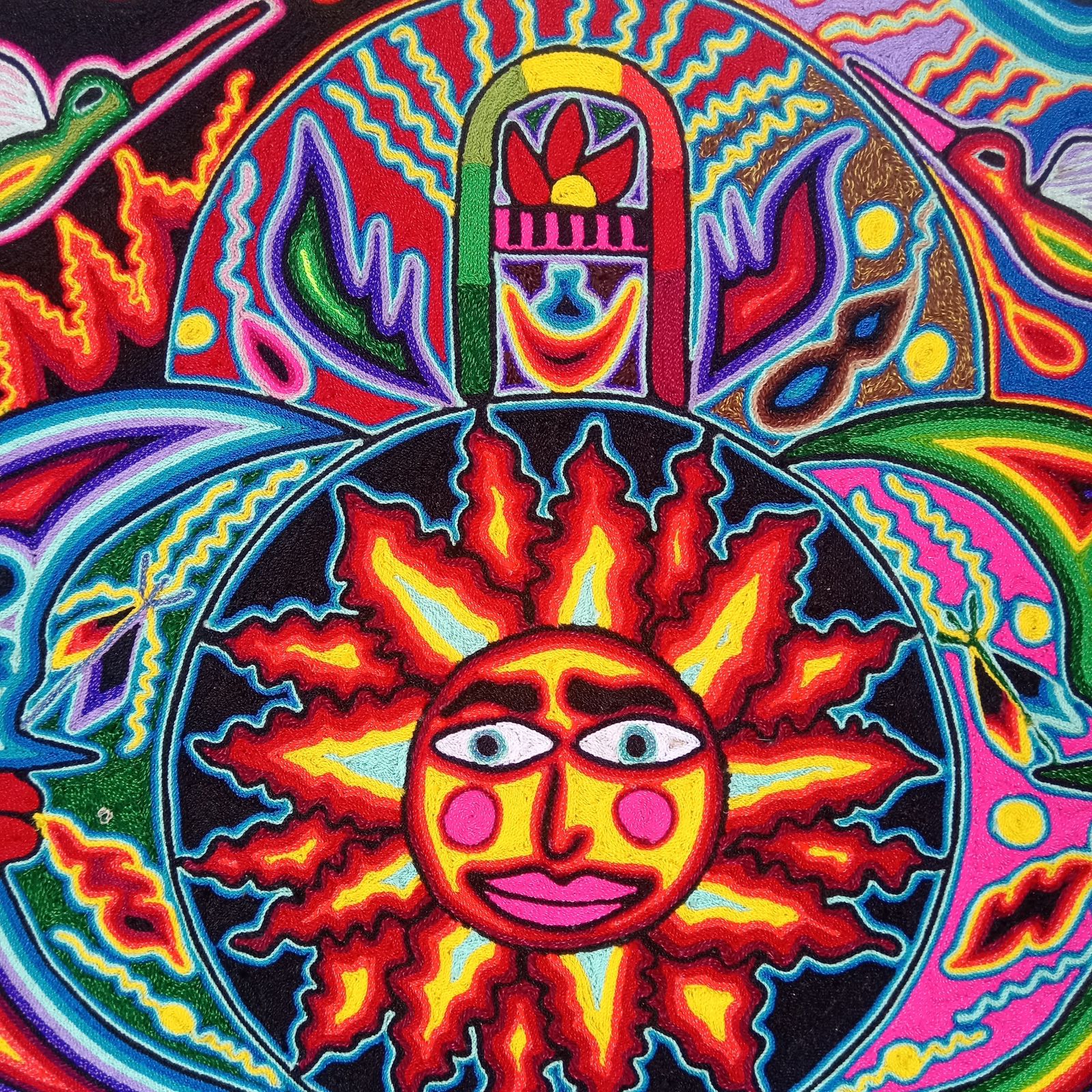 This is an extraordinary yarn painting that measures 24"x 24". The Wixarika (Huichol) people are internationally acclaimed for their artwork. This piece is adorned with symbology from their culture.